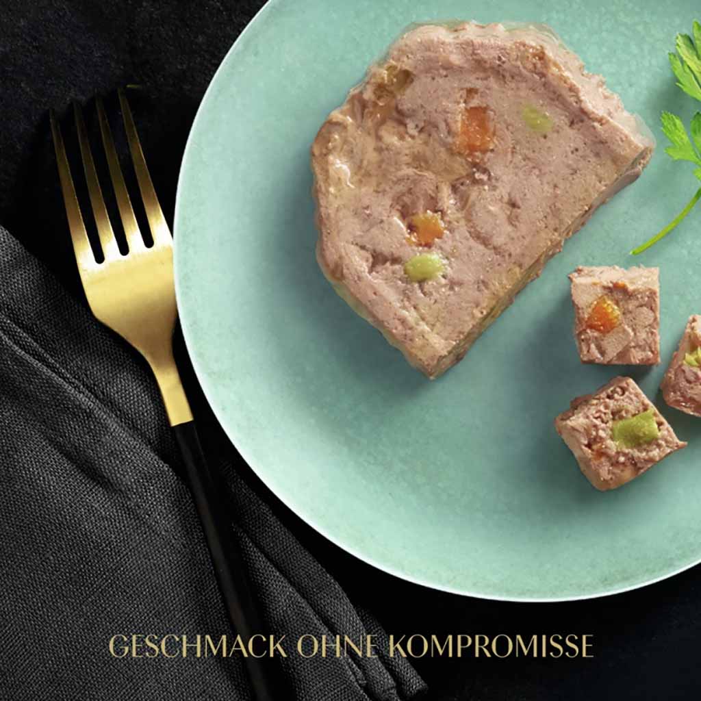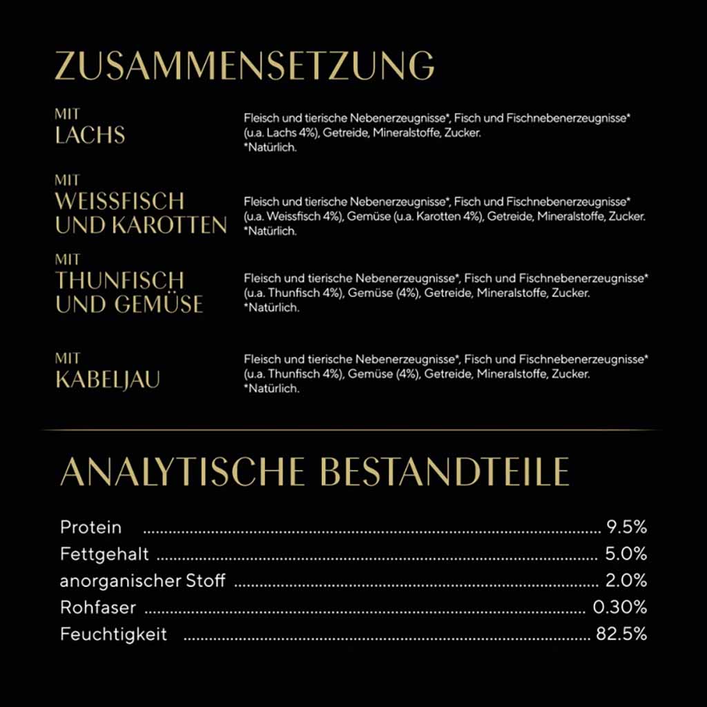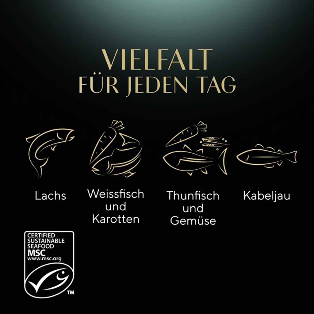 Inhalt: 32 x 85 g = 8 x Lachs, 8 x Weißfisch & Karotten, 8 x Thunfisch & Gemüse, 8 x Kabeljau