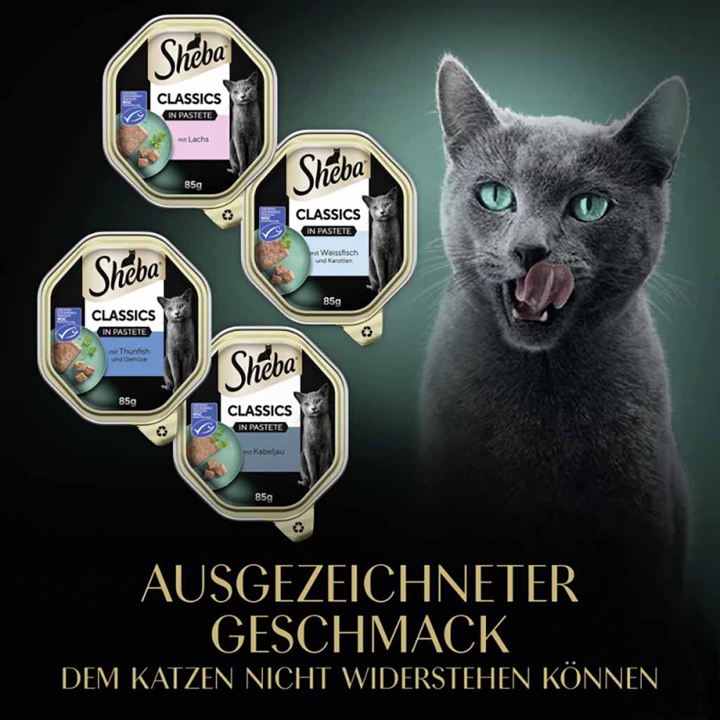 Die Sheba Classics in Pastete Fisch Variation bieten deiner Katze jeden Tag einen besonderen Genuss. Das hochwertige Katzen-Nassfutter enthält fein abgestimmte Rezepturen mit Lachs, Weißfisch, Thunfisch und Kabeljau, zubereitet als zarte Pastete. Jede Portion bietet ausgewogene Nährstoffe und natürliche Zutaten – ideal für die tägliche Fütterung. Die praktischen 85g-Schälchen ermöglichen einfaches Portionieren und garantieren Frische bei jeder Mahlzeit. Sheba steht seit über 30 Jahren für Qualität und Geschmack, dem Katzen vertrauen. Frei von künstlichen Farb- und Konservierungsstoffen.