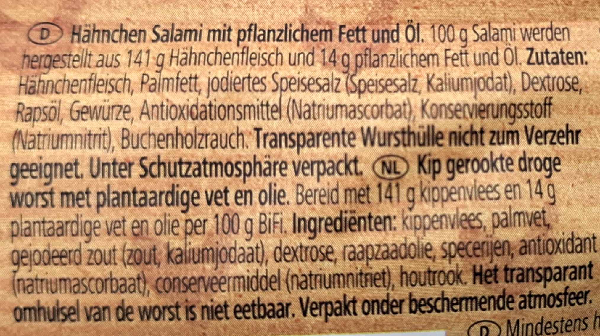 100 g Salami werden hergestellt aus 141 g Hähnchenfleisch und 14 g pflanzlichem Fett und Öl.