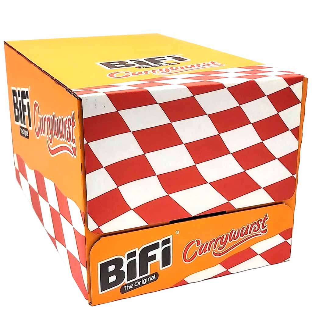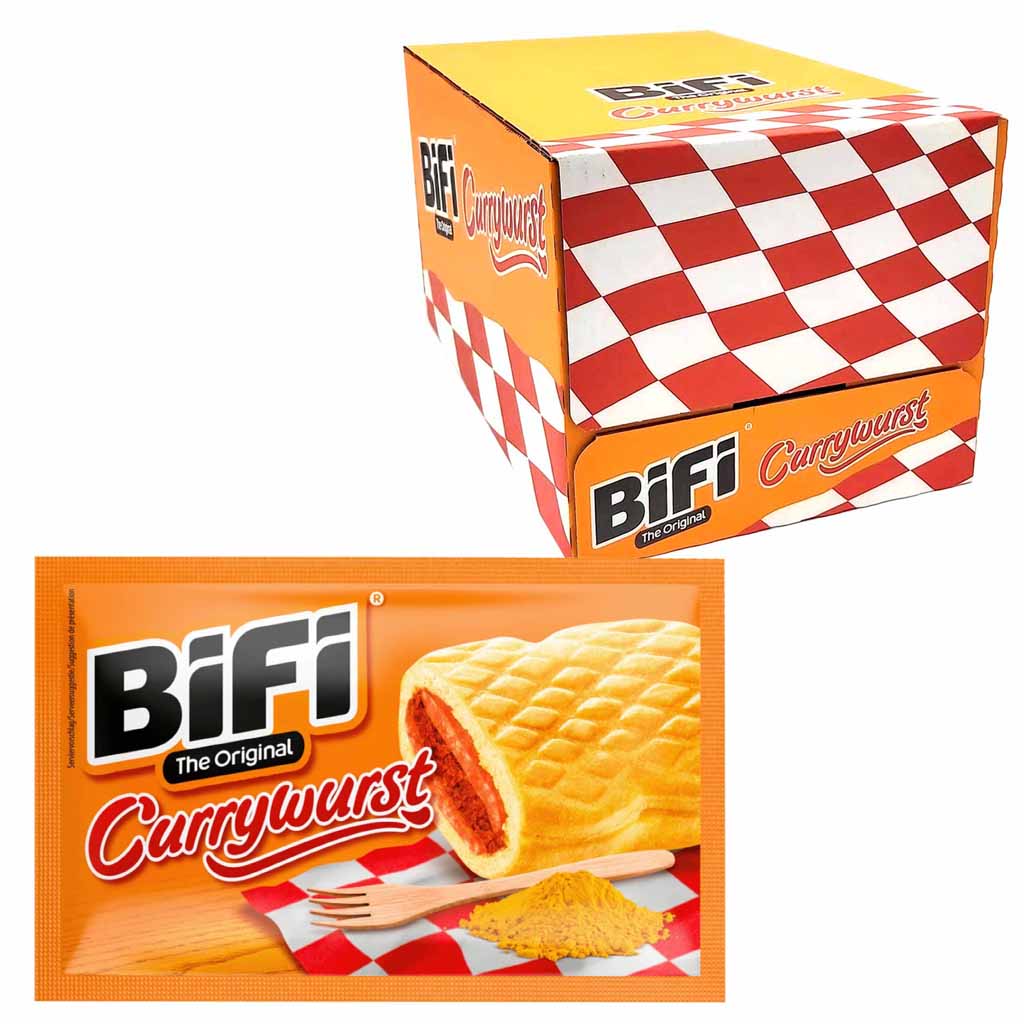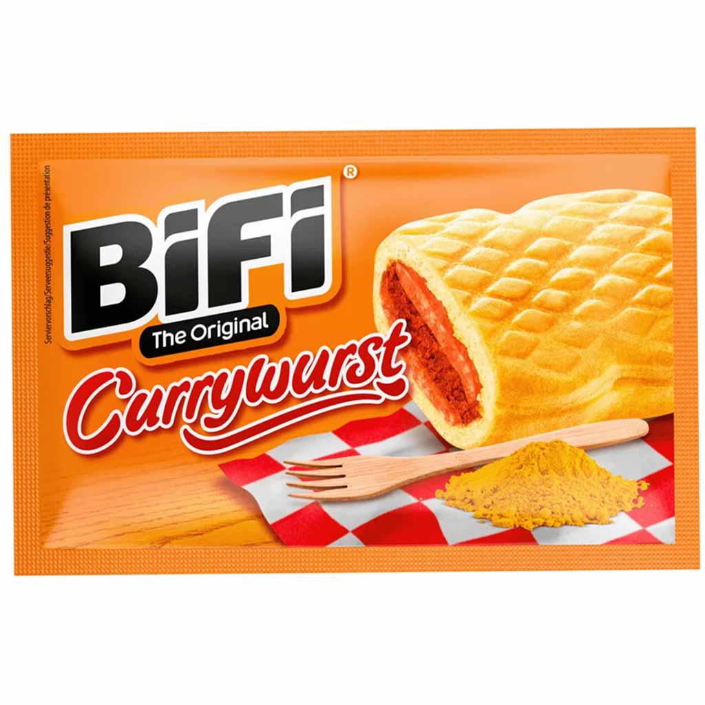 Weizengebäck mit Salami (18%), Schinkenwurst (9%) und Tomaten-Curry (0,3%) Sauce. 20 Bifi Currywurst im Aufsteller. Deutschlands beliebtestes Fast Food als praktischer Bifi Snack. Bifi kommt auf die Currywurst und zeigt, dass man die auch ohne großes Kleckern essen kann. In einem leckeren Teigmantel steckt alles was zu einer Currywurst gehört: würzige Wurst, fruchtig-tomatige Sauce und jede Menge feuriges Currypulver.