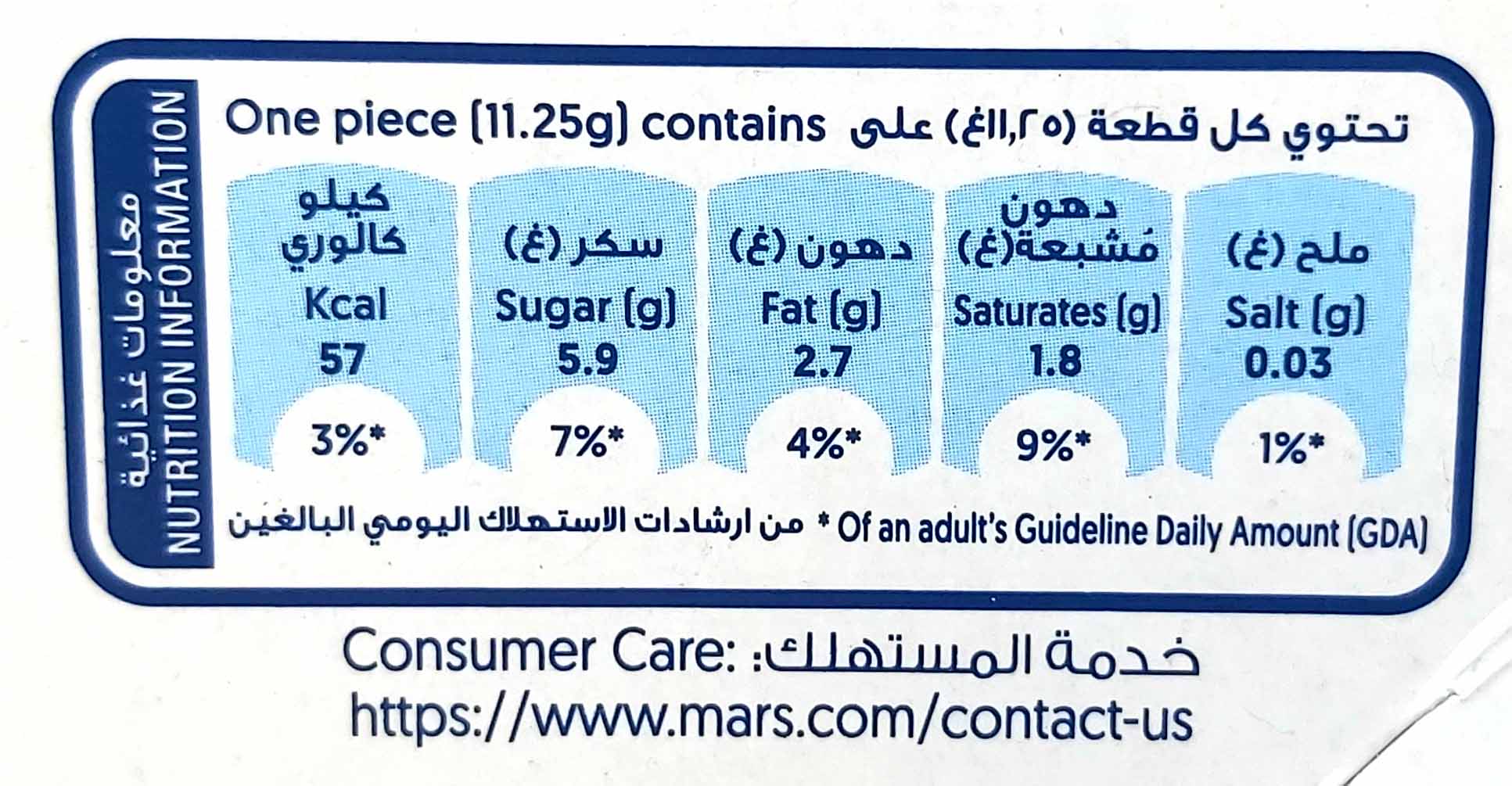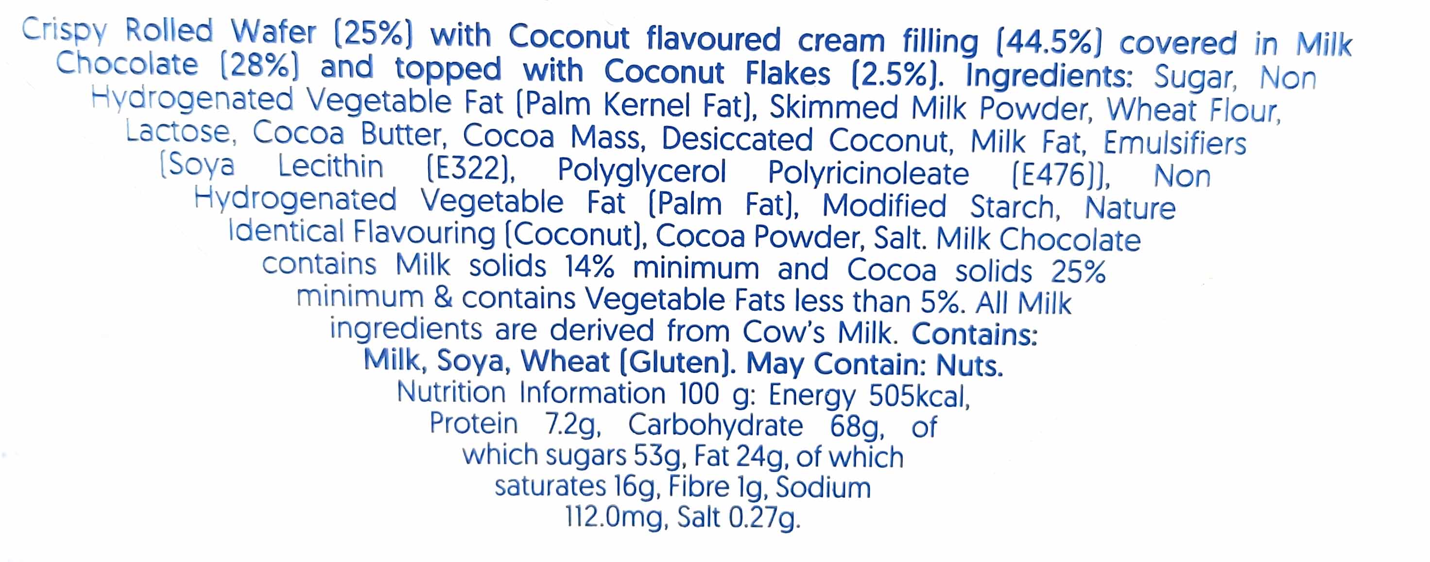 Zutaten: Zucker, ungehärtetes Pflanzenfett Palmkernfett), MAGERMILCHPULVER, WEIZENMEHL, LAKTOSE, Kakaobutter, Kakaomasse, Kokosraspeln, MILCHFETT, Emulgatoren (SOJALECITHIN (E322), Polyglycerinpolyricinoleat (E476), unhydriertes Pflanzenfett (Palmfett), modifizierte Stärke, naturidentisches Aroma (Kokosnuss), Kakaopulver, Salz. Milchschokolade enthält mindestens 14 % MILCHFESTSTOFFE und weniger als 5 % pflanzliche Fette.