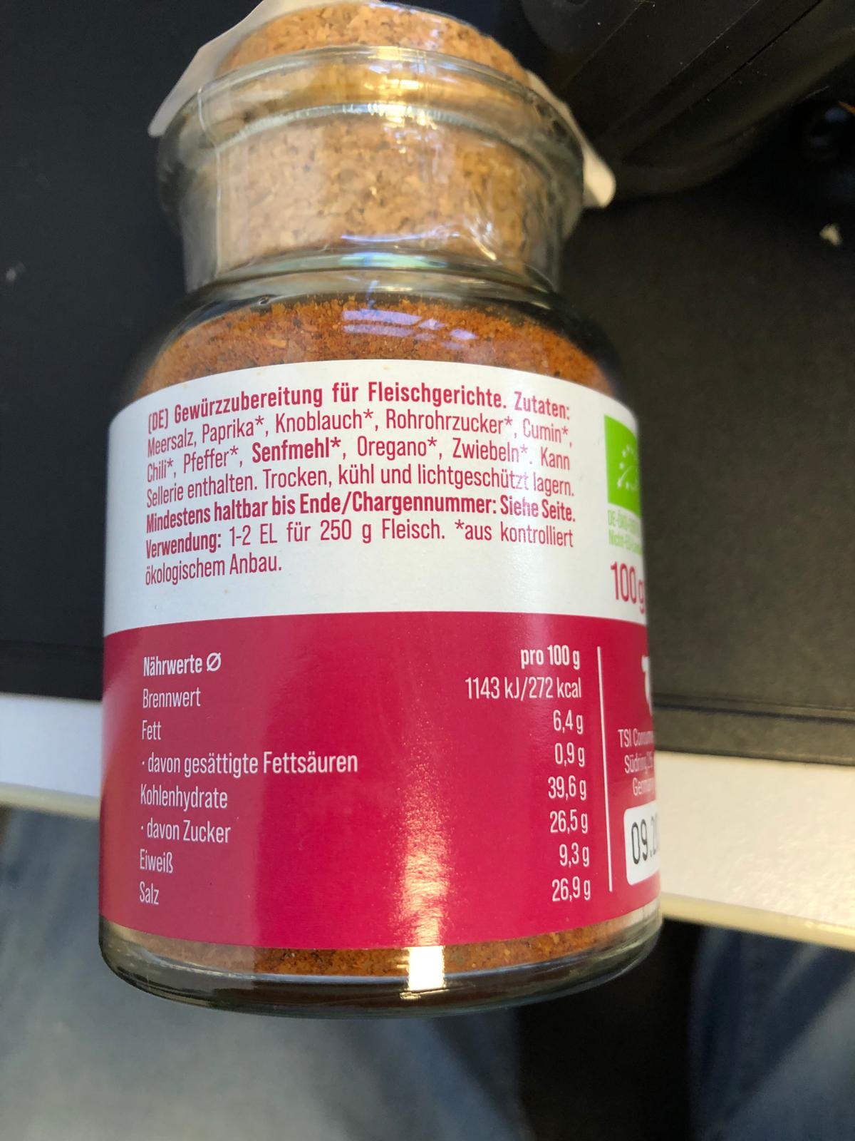 Zutaten: Meersalz, Paprika*, Knoblauch*, Rohrohrzucker*, Cumin* (Kreuzkümmel), Chili*, Pfeffer*, Senfmehl*, Oregano*, Zwiebeln*. (*aus kontrolliert ökologischem Anbau.)