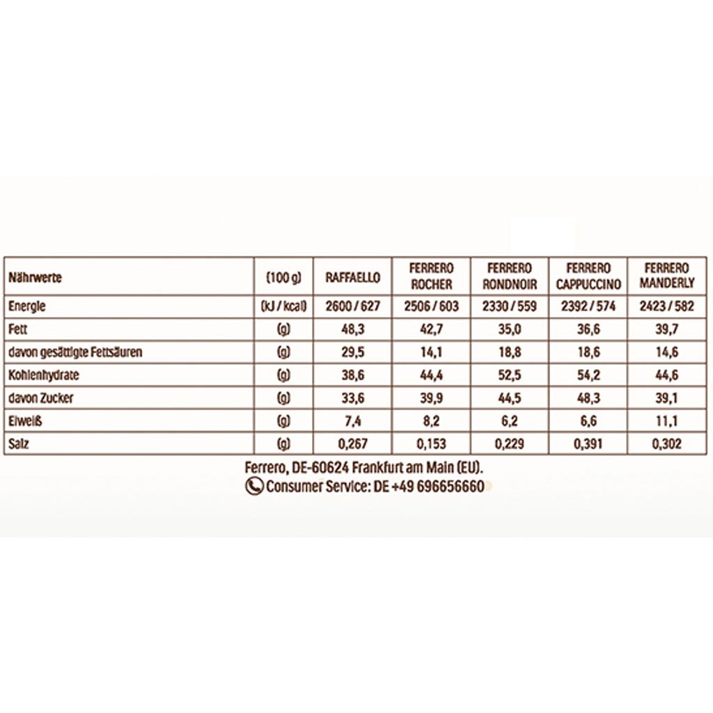 Zutaten: RAFFAELLO: Kokosraspel (25,5 %), pflanzliche Fette (Palm, Shea), Zucker, MANDEL (8%), MAGERMILCHPULVER, SÜSSMOLKENPULVER, WEIZENMEHL, Tapiokastärke, Aromen, Emulgator Lecithine (SOJA), Backtriebmittel Natriumhydrogencarbonat, Salz.