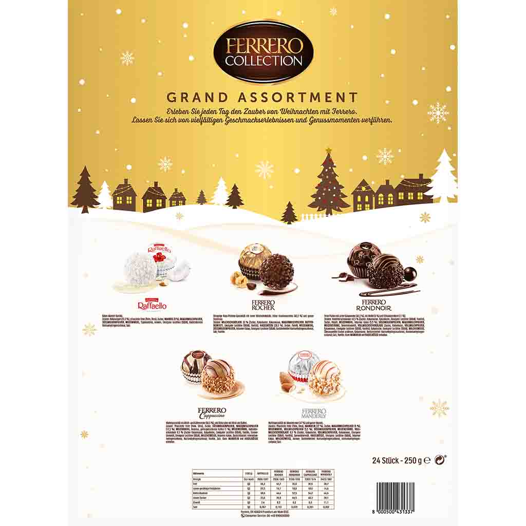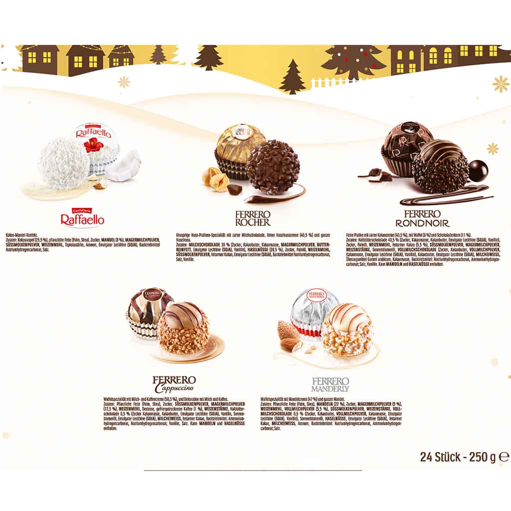 Kokos-Mandel-Konfekt. Ferrero Pralinen Grand Assortment Adventskalender bietet 24 köstliche Pralinenmomente mit einer exklusiven Auswahl aus dem Ferrero-Sortiment: Rondnoir, Rocher Classic, Raffaello, Ferrero Cappuccino und Ferrero Manderly.