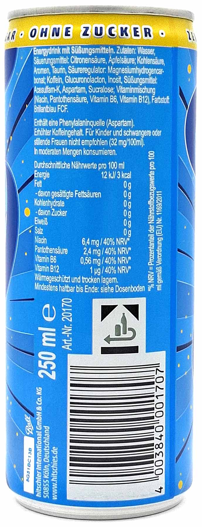 Zutaten: Wasser, Säuerungsmittel: Citronensäure, Äpfelsäure; Kohlensäure, Aromen, Taurin, Säureregulator: Magnesiumhydrogencarbonat; Koffein, Glucuronolacton, Inosit, Süßungsmittel: Acesulfam-K, Aspartam, Sucralose; Vitaminmischung (Niacin, Pantothensäure, Vitamin B6, Vitamin B12), Farbstoff: Brillantblau FCF. "Erhöhter Koffeingehalt.