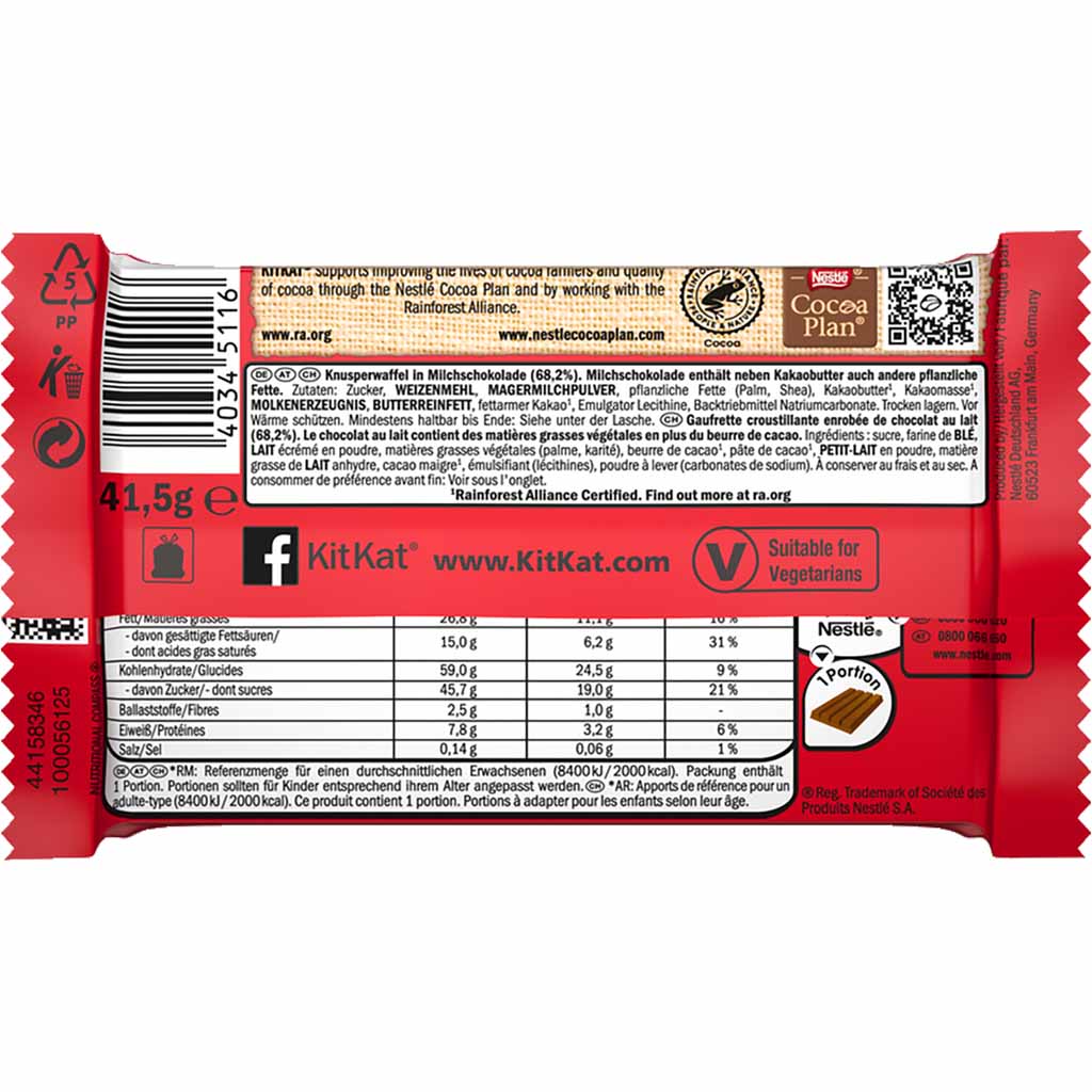 Knusperwaffel in Milchschokolade (68,2 %). Milchschokolade enthält neben Kakaobutter auch andere pflanzliche Fette. Der Snack für die kurze Pause. KitKat Classic sind knusprige, längliche Waffeln in zarter Vollmilchschokolade. Der unvergleichlich cremig-knackige Riegel lässt sich in 4 Einzelriegel "knacken" und ist ideal für unterwegs und zum Teilen geeignet.