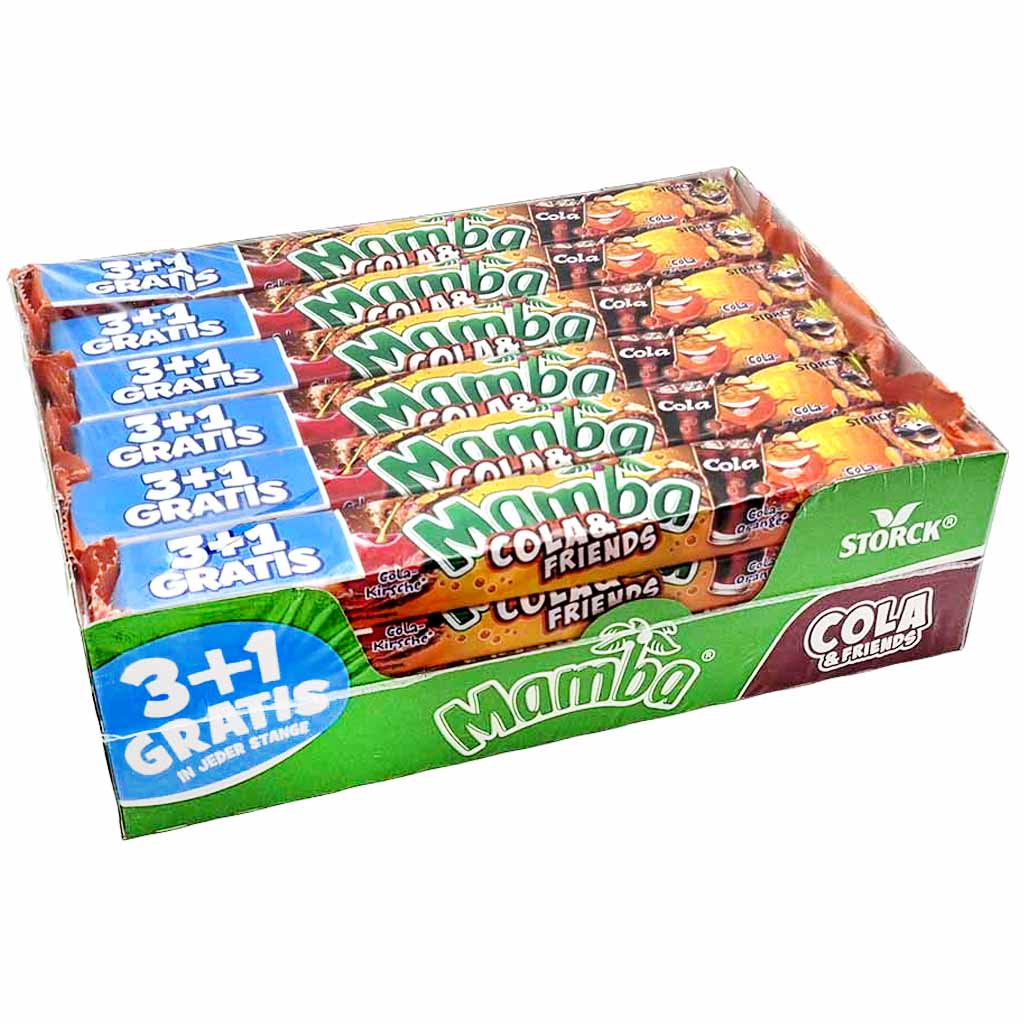 Kaubonbons mit Cola- und Fruchtgeschmack. Inhalt: 24x4x6=576 einzeln verpackte Kaubonbons. Mamba Cola and Friends, das ist der fröhliche Kaubonbonspaß mit dem beliebten Cola-Geschmack. Schön kauig und lecker für alle Cola-Fans! Viel Colageschmack in 4 Päckchen mit je 6 Kaubonbons. Freunde, das wird ein Spaß! Mamba Cola & Friends vereint den fröhlich-fruchtigen Geschmack von Mamba mit spritzigem Cola-Geschmack in den Sorten Cola-Orange, Cola-Zitrone, Cola-Kirsche und Cola-Ananas.