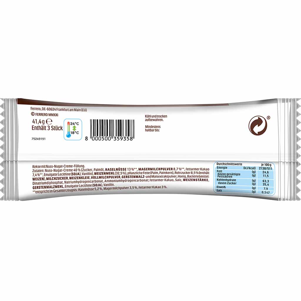 Kekse gefüllt mit Haselnuss und Kakao-Aufstrich NUTELLA®. Immer 3 Kekse im 41,4g Riegelpack. 28x 3er Riegel im Thekendisplay. Die Nutella Biscuits vereinen einen knusprigen Keks mit einem cremigen Herz aus feinstem Nutella. Ein Muss für jeden Nutella und Nougatcreme-Fan. Die leckeren Kekse kommen in einem praktischen wiederverschließbaren Frischebeutel.