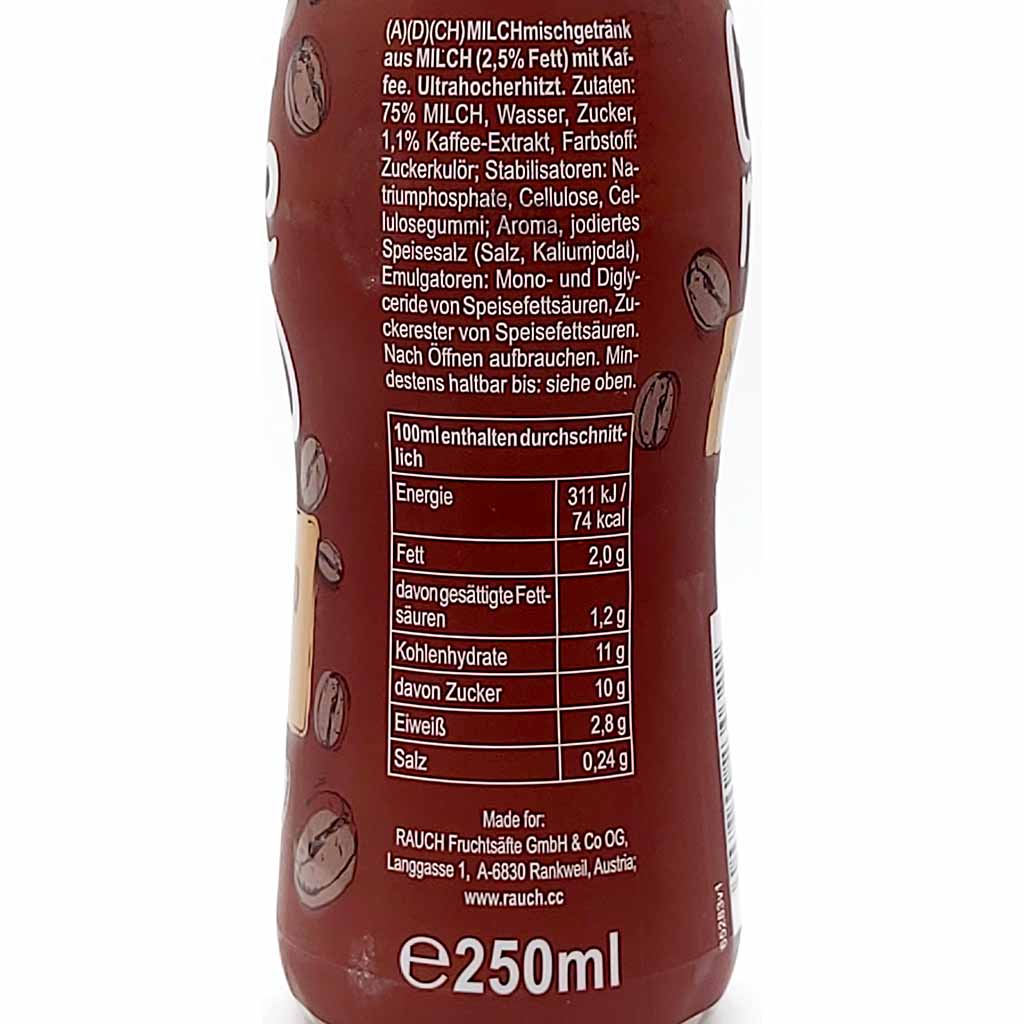 Zutaten: 75% MILCH, Wasser, Zucker, 1,1% Kaffee-Extrakt, Farbstoff: Zuckerkulör, Stabilisatoren: Natriumphosphate, Cellulose, Cellulosegummi; Aroma, jodiertes Speisesalz (Salz, Kaliumjodal), Emulgatoren: Mono- und Diglyceride von Speisefettsäuren, Zuckerester von Speisefettsäuren.