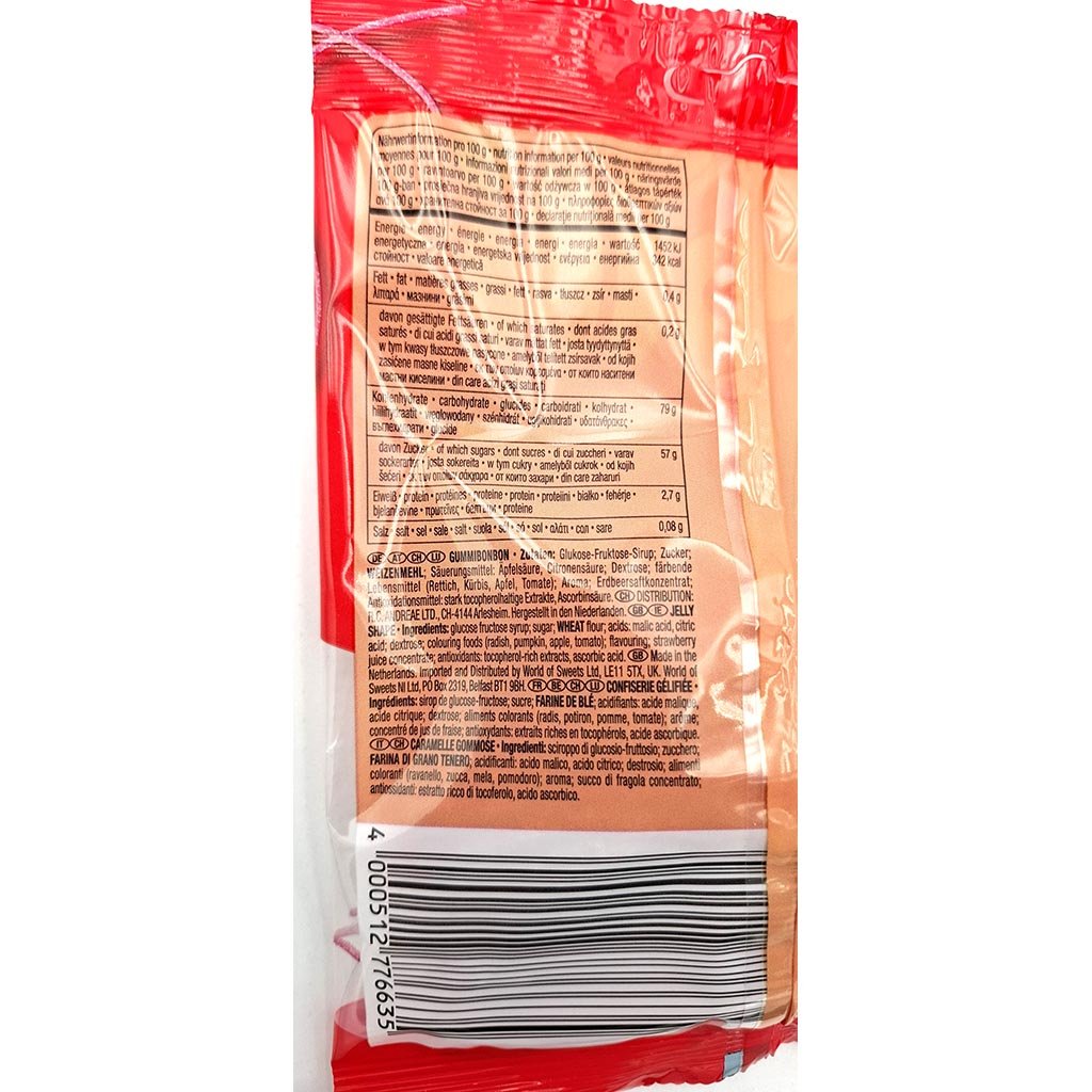 Zutaten: Glukose-Fruktose-Sirup; Zucker; WEIZENMEHL; Säuerungsmittel: Äpfelsäure, Citronensäure; Dextrose; Aroma; färbende Lebensmittel (Apfel, Kürbis, Tomate, Rettich); Antioxidationsmittel: Ascorbinsäure, stark tocopherolhaltige Extrakte.