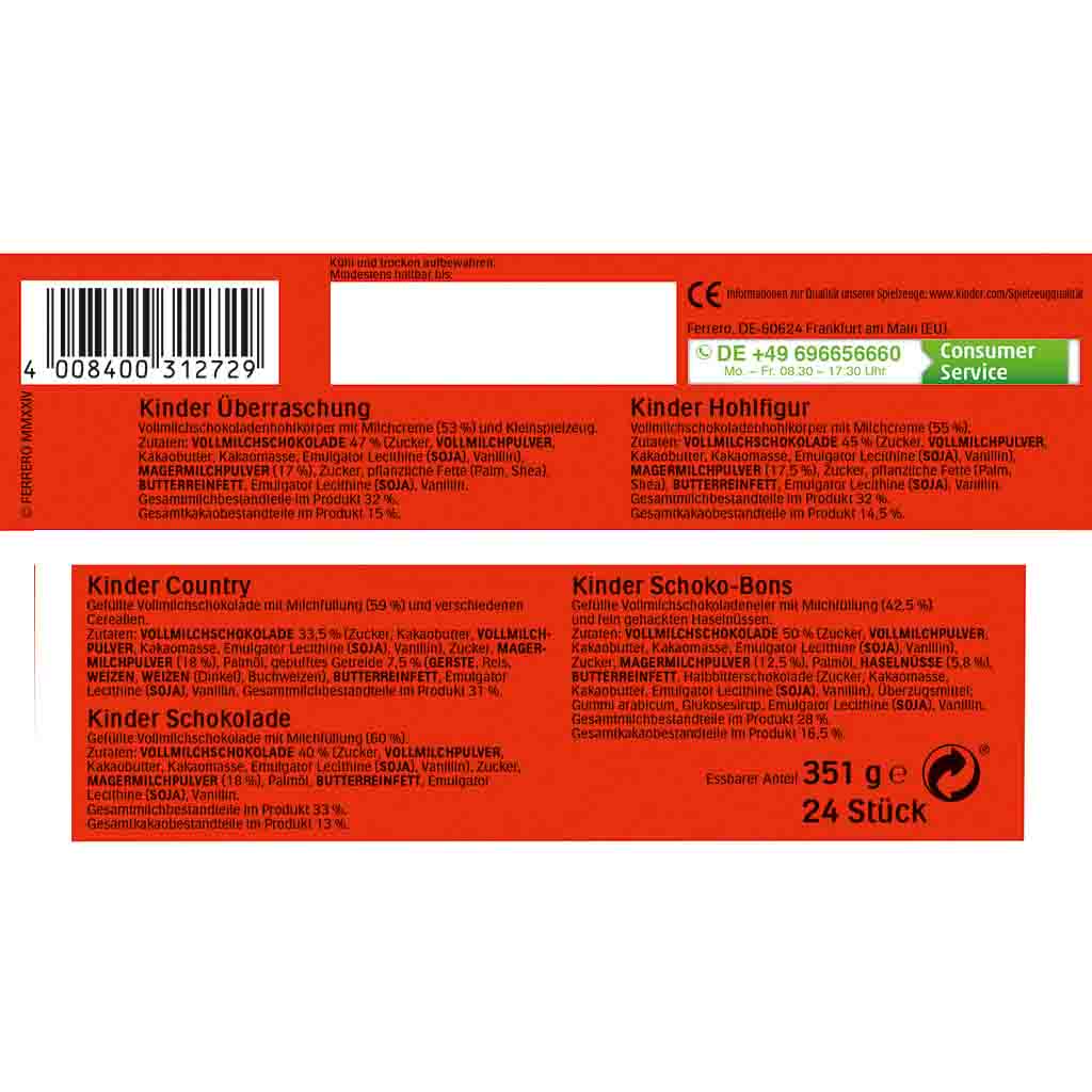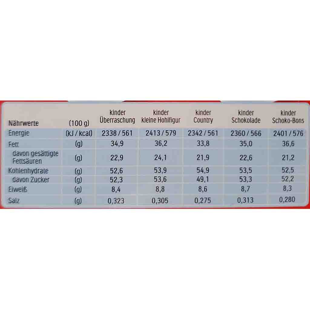 KINDER HOHLFIGUR: VOLLMILCHSCHOKOLADE 45 % (Zucker, VOLLMILCHPULVER, Kakaobutter, Kakaomasse, Emulgator Lecithine (SOJA), Vanillin), MAGERMILCHPULVER (17,5 %), Zucker, pflanzliche Fette (Palm, Shea), BUTTERREINFETT, Emulgator Lecithine (SOJA), Vanillin. Gesamtmilchbestandteile im Produkt 32 %. Gesamtkakaobestandteile im Produkt 14,5 %.