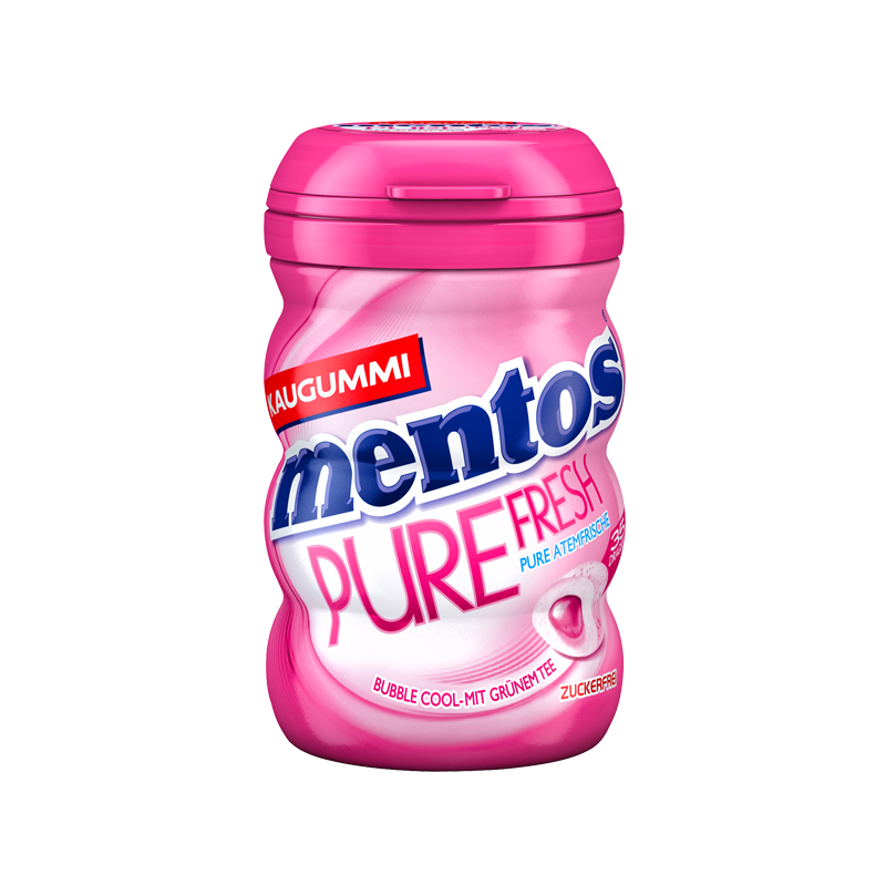 Kaugummidragees mit Süßungsmitteln. Immer 35 Dragees in jeder Dose. Typisch Mentos: Die großen gefüllten Kaugummis mit Frische-Kick im Kern sorgen für ein einzigartig frisches & langanhaltendes Kauerlebnis. Die zuckerfreie Sorte Pure Fresh Bubble Cool erfrischt den Atem und punktet stets mit fruchtig-süßem Geschmack. In der praktischen charakteristisch-kurvigen Dose sind die Lieblings-Kaugummis immer griffbereit.