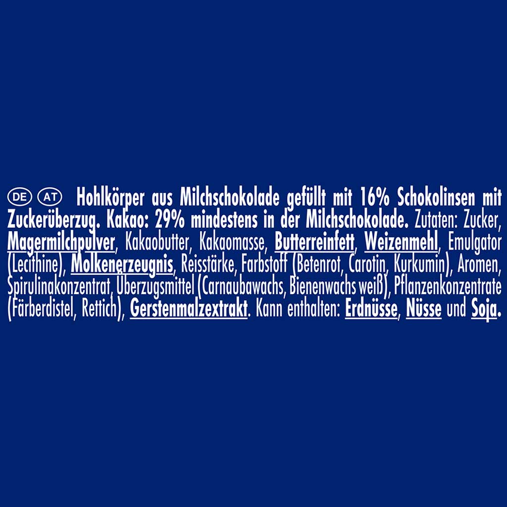 Hohlfigur aus Milchschokolade gefüllt mit 16% Mini-Schokolinsen.