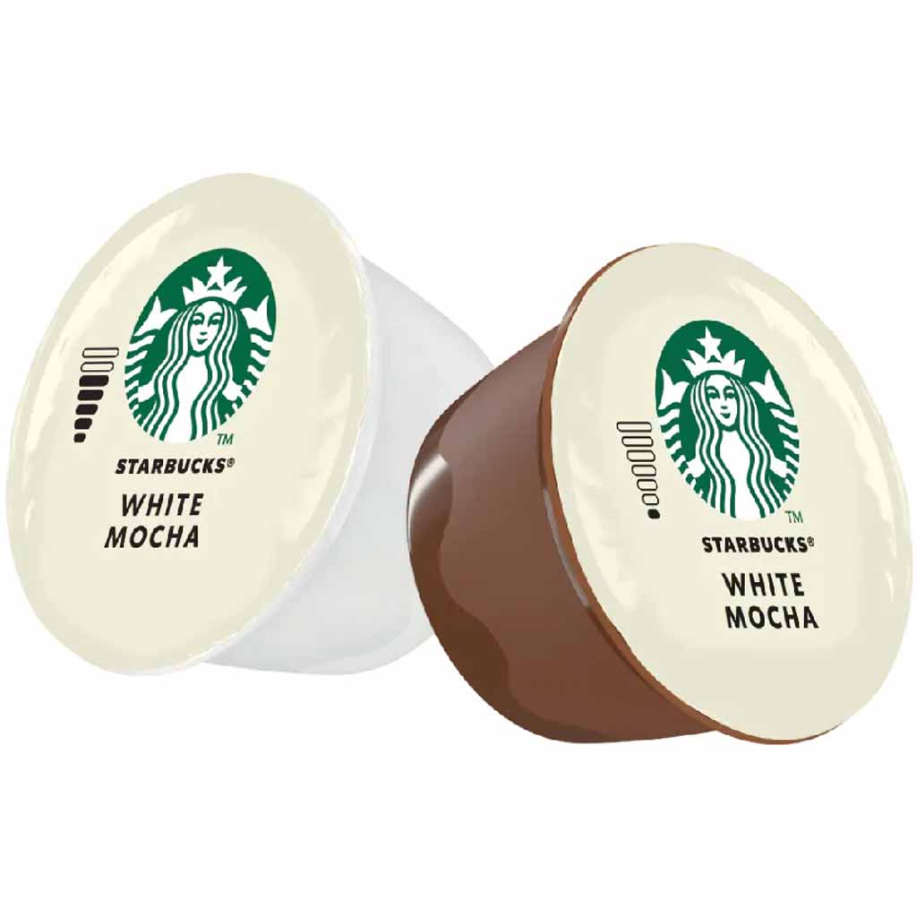 6 Kapseln Milch für Starbucks® White Mocha für Dolce Gusto® und 6 Kapseln Kaffee für Starbucks® White Mocha für Dolce Gusto®. Hochwertige Arabica-Bohnen gemischt mit Milch und dem Geschmack von weißer Schokolade. Perfekt für die süße Kaffeepause daheim. STARBUCKS® Zuhause genießen, ohne das Haus zu verlassen. Inspiriert vom klassischen White Mocha von STARBUCKS®, haben wir dieses wohlschmeckende und reichhaltige Getränk kreiert, das du zu Hause mit den gleichen hochwertigen Arabica-Bohnen zubereiten kannst, die auch in den STARBUCKS® Coffee Shops verwendet werden. Gemischt mit Milch und dem köstlichen Geschmack nach weißer Schokolade und gekrönt mit einer weichen Schaumschicht, damit du ein herrlich vertrautes STARBUCKS®-Getränk genießen kannst.