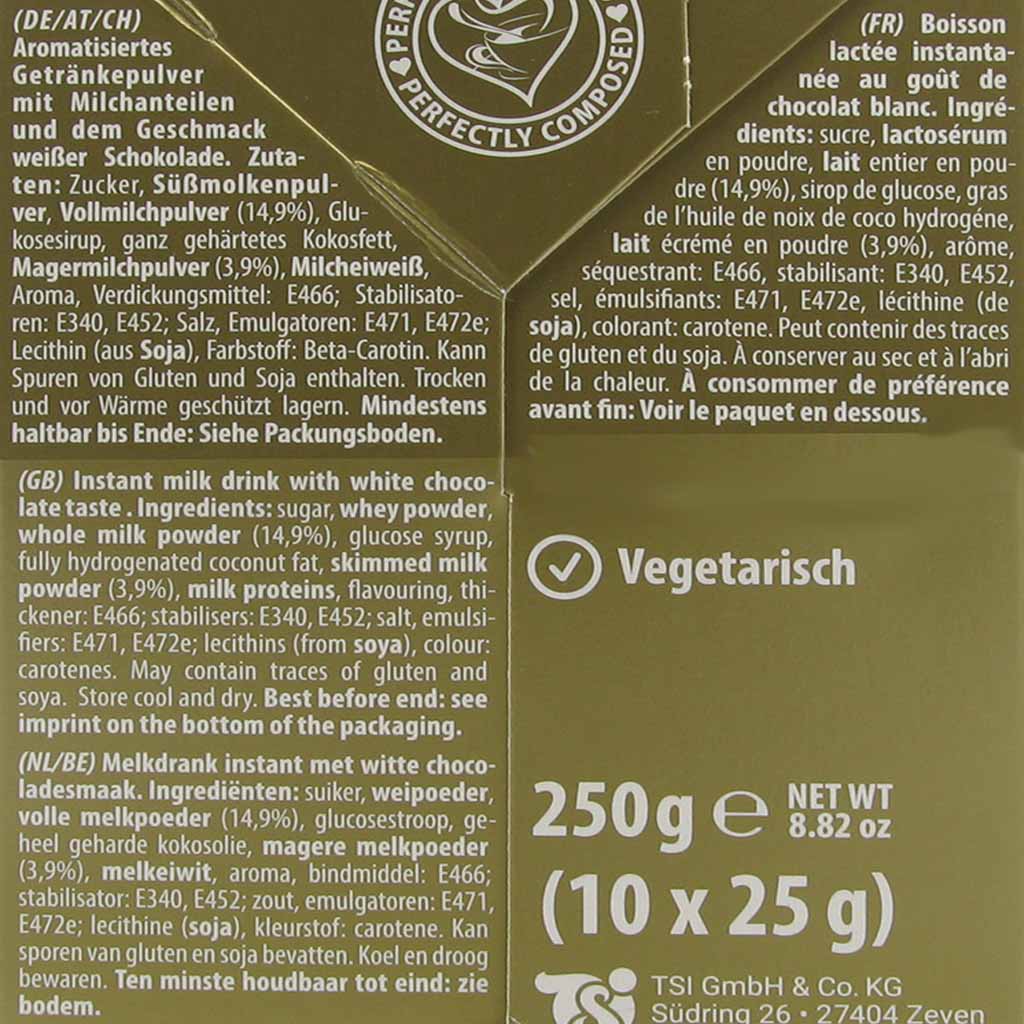 Aromatisiertes Getränkepulver mit Milchanteilen und den Geschmack weisser Schokolade.