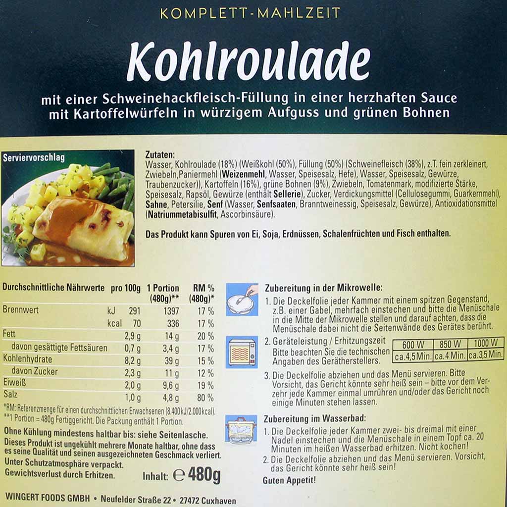 Fertiggericht, verzehrfertig. Kohlroulade mit einer Schweinehackfleisch-Füllung in einer herzhaften Sauce mit Kartoffelwürfeln in würzigen Aufguss und grünen Bohnen.