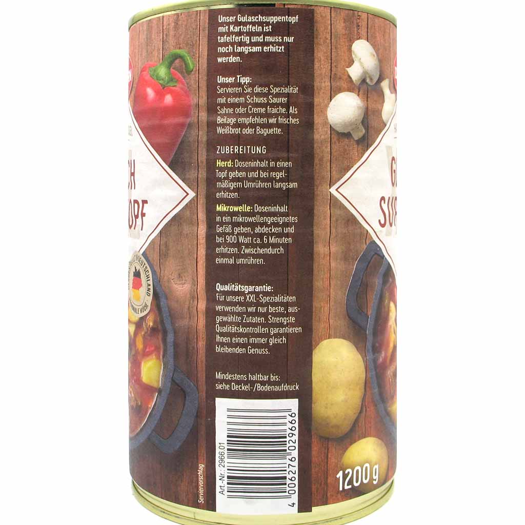 Gulasch Suppentopf mit zartem Rindfleisch mit Kartoffeln verzehrfertig in Konserve. Schonend gegart und nach Omas alter Haus Rezeptur hergestellt