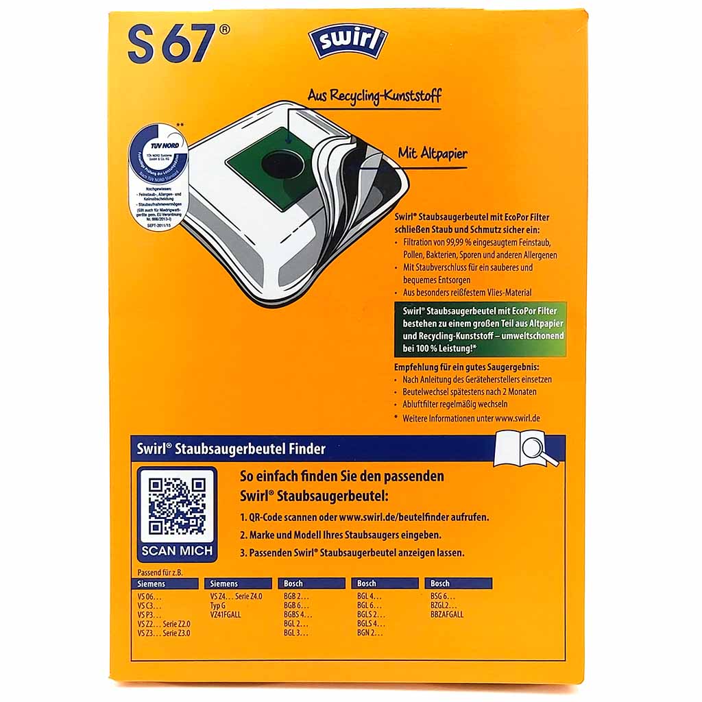 Swirl Stausauger Beutel S67 Siemens Bosch