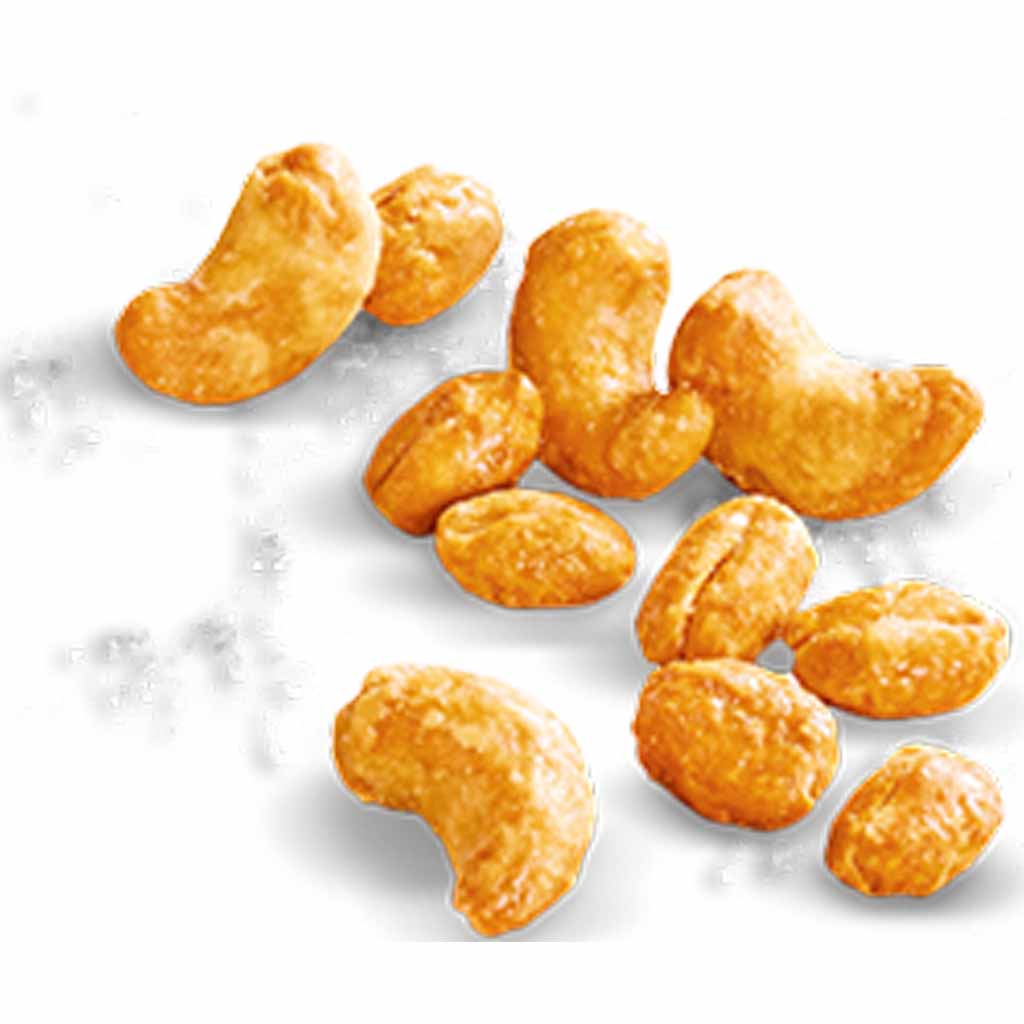 Zutaten: CASHEWKERNE (33%), ERDNUSSKERNE (32%), Zucker, Honig (3%), pflanzliche Öle (Sonnenblume, Shea), Geliermittel (E414), Salz, Farbstoff (E150c).