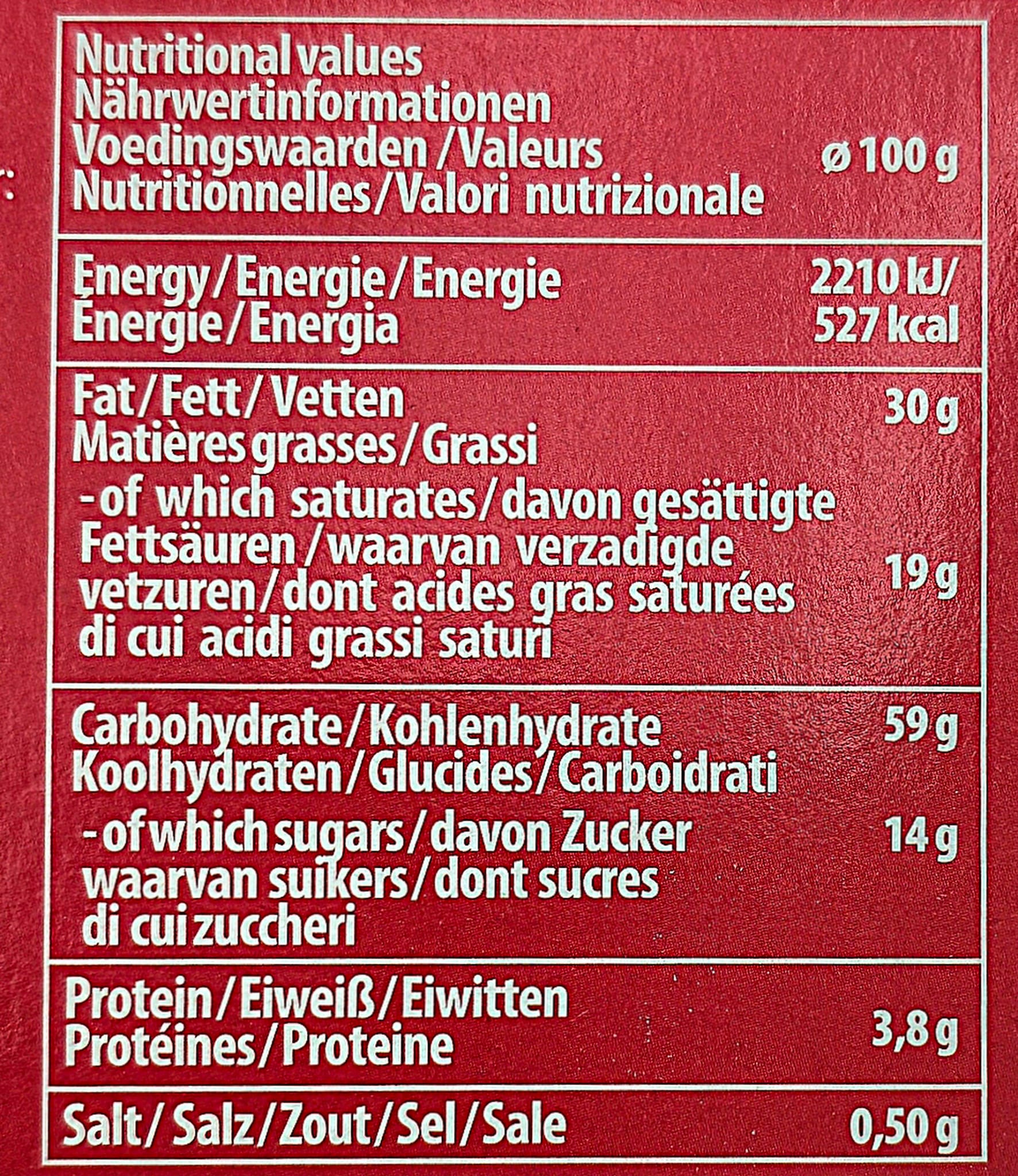 DE Kekse mit Milchcremefillung und Milchglasur mit Keksstuckchen Red Velvet. Zutaten: Weizenmehl, Milchglasur .27 % (Zucker, pflanzliche Fette (Palmõl, Palmkernol), Vollmilchpulver 4,1 %, Magermilchpulver 1,8%, Emulgator. ojalecithin, Aroma), Milchcremefullung 25 % (Zucker, pflanzliche Fette (Palmõl, Rapsol), Molikenpulver (aus Miich), Magermilchpulver 1,8 %, Aroma), pflanzliche Fette (Palmöl, Rapsöl), Zucker, Kekse 2% (Weizenmehl, Pflanzliche Fette (Palmöl, RapsöI), Zucker, Backtriebmittel: Natriumcarbonate; Salz, Aroma, Lebensmittelfarbstoff-Mischung (Maltodextrin, Rote- Bete-Konzentrat, Ascorbinsäure E300, Zitronensāure E330), Backtriebmittel: Natriumcarbonate; Salz, Aroma, Lebensmittelfarbstoff-Mischung (Maltodextrin, Rote-Bete-Konzentrat, Ascorbinsäure E300, Zitronensäure E330).Das Produkt kann enthalten: Erdnusse und andere Nüsse, Sesamsamen und Eier. An einem kuhlen und trockenen Ort aufbewahren. Mindestens haltbar bis und Chargennummer.: siehe Aufdruck auf der Seite der Verpackung.
