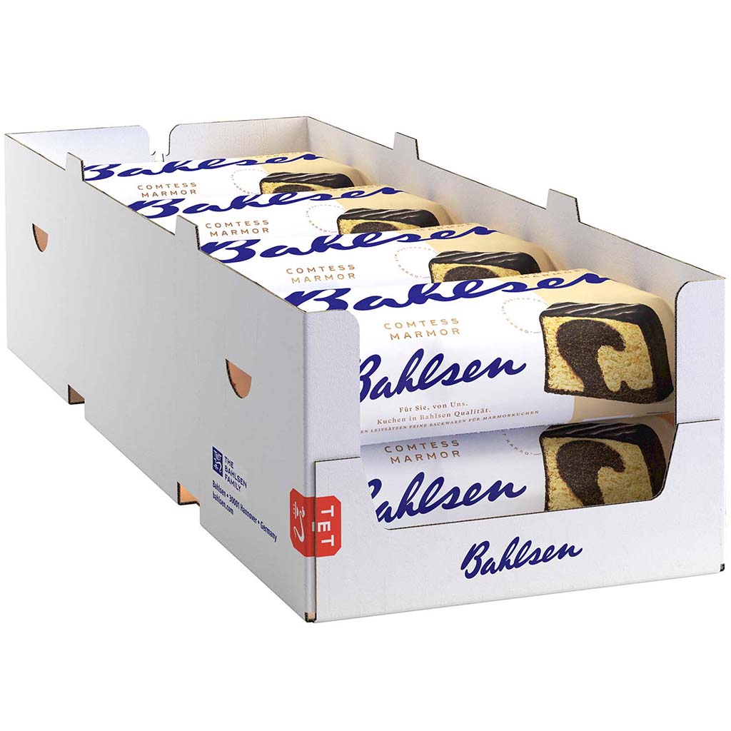 Rührkuchen mit Schokolade und kakaohaltiger Glasur. Bahlsen Comtess Marmor ist der Klassiker unter den Gebäckspezialitäten. Der köstlich-saftige Marmor-Rührkuchen vereint hellen und dunklen Teig zu einer traditionellen Einheit mit aromatischer Schokoladenglasur. Kosten Sie diese Leckerei und erleben Sie den weichen Biss, der dem Kuchen seinen einzigartigen Charakter verleiht. Die wiederverschließbare Verpackung sorgt für Frische und beste Qualität