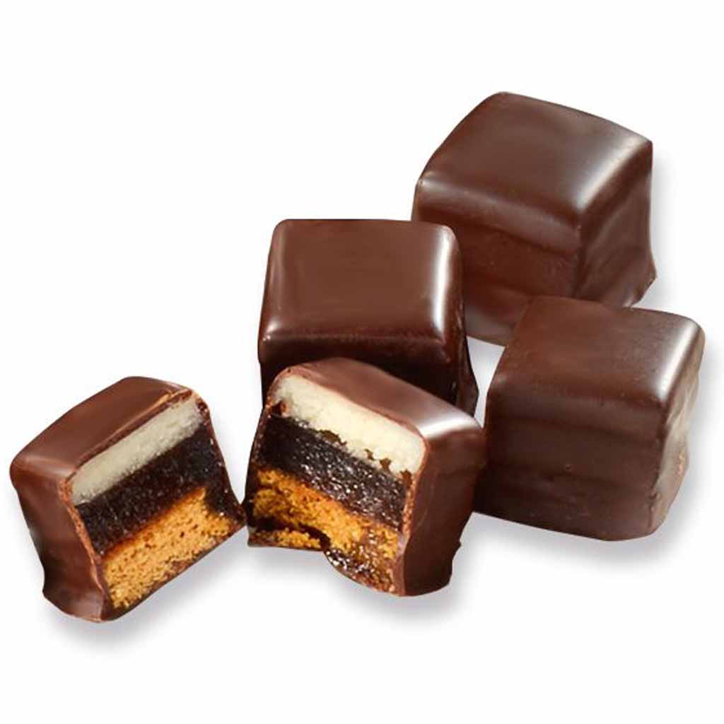 Dominosteine mit Überzug aus Zartbitterschokolade (25%), doppelt gefüllt.