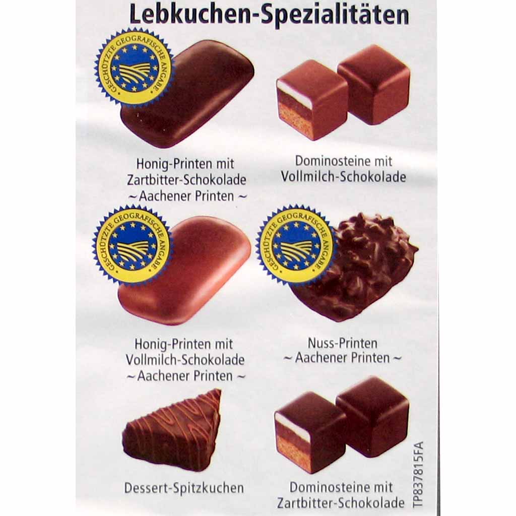 Dominosteine mit Zartbitter- und Vollmilchschokolade, Nuss-Saftprinten mit Zartbitterschokolade, Honig-Printen mit Zartbitterschokolade, Honig-Saftprinten mit Vollmilchschokolade sowie Spitzkuchen mit Zartbitter- und Vollmilchschokolade. Abwechslungsreiche Lebkuchenmischung mit typisch Aachener Saison-Spezialitäten, präsentiert in einer attraktiven Blechdose mit naivem Aachener Weihnachtsmarktmotiv.