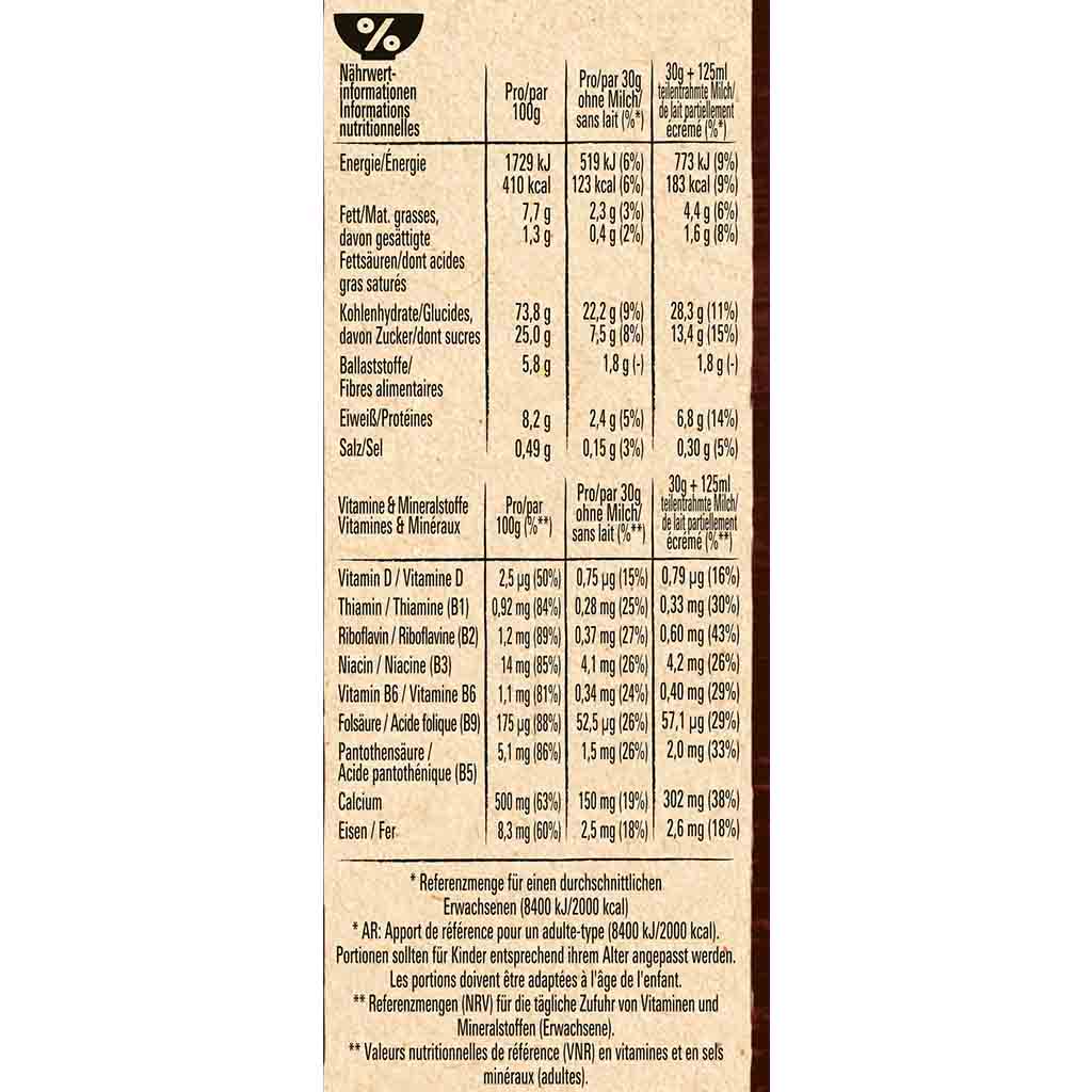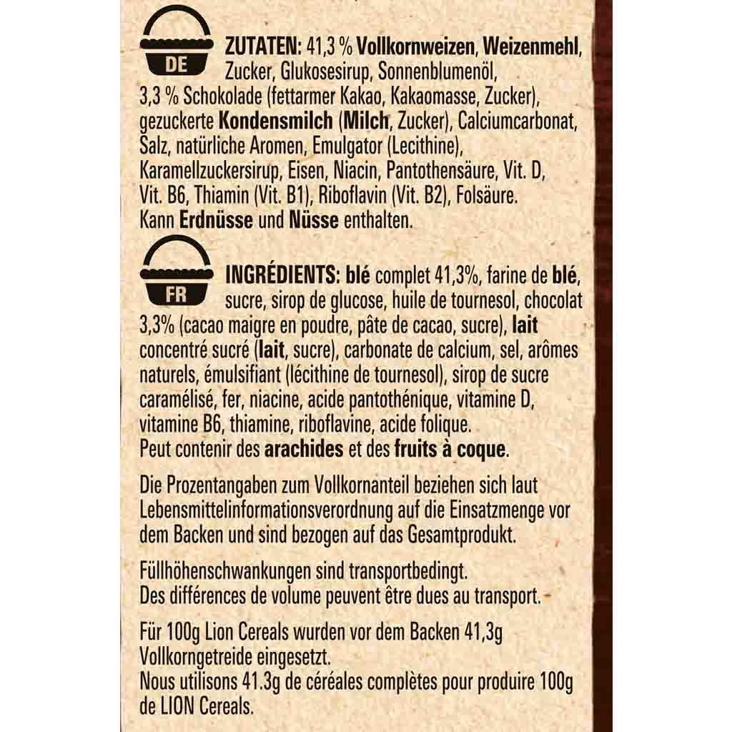 Zutaten: 41,3% VOLLKORNWEIZEN, WEIZENMEHL, Zucker, Glukosesirup, Sonnenblumenöl, 3,3% Schokolade (fettarmer Kakao, Kakaomasse, Zucker), gezuckerte KONDENSMILCH (MILCH, ZUCKER), Calciumcarbonat, Salz, natürliche Aromen, Emulgator (Lecithine), Karamellzuckersirup, Eisen, Niacin, Pantothensäure, Vit. D. Vit. B6, Thiamin (Vit. B1), Riboflavin (Vit. B2), Folsäure.