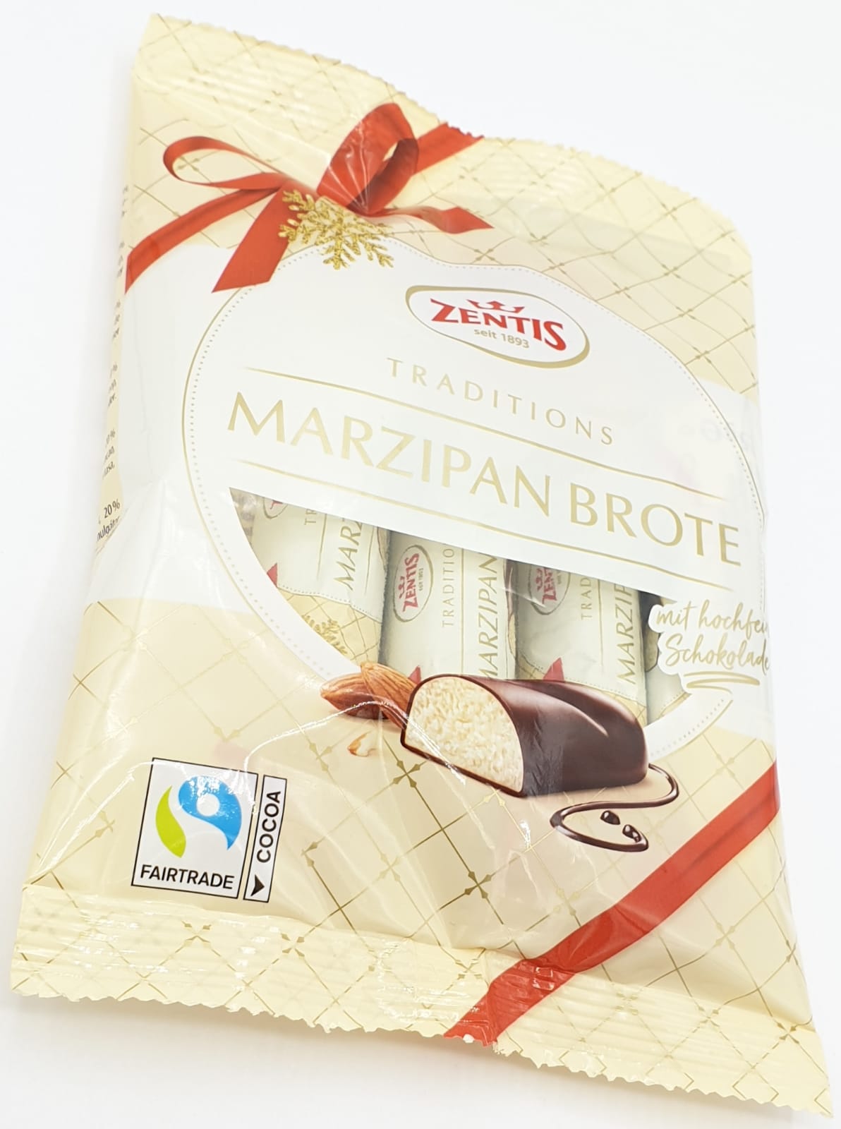 Zutaten: Marzipan (88%) mit dunkler Schokolade überzogen (12%). Schokolade: Kakaofeststoffe mindestens 54%. Zutaten: Zucker, gemahlene Mandeln (24%), Kakaomasse, Wasser, Glukosesirup, Kakaobutter, Feuchthaltemittel: Invertase; Emulgator: Lecithine. Kann andere Baumnüsse, Soja, Gluten und Milch enthalten.