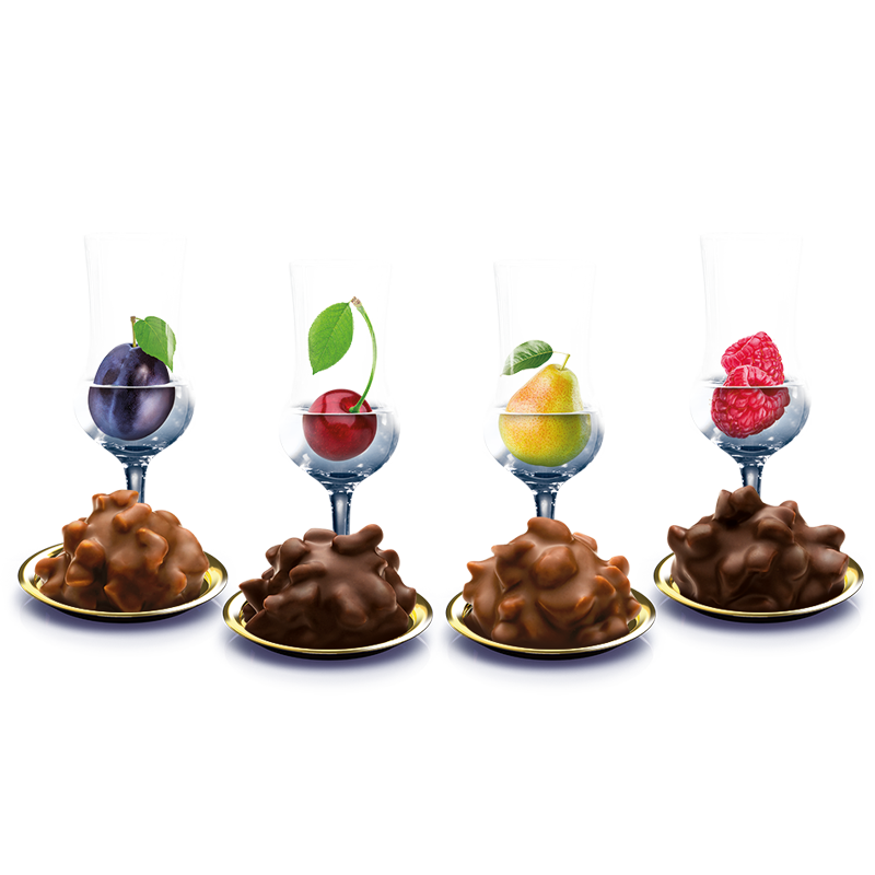 Flüssig gefüllte Alkohol-Pralinen mit Milchschokolade-Überzug und Haselnüssen, 4-fach sortiert