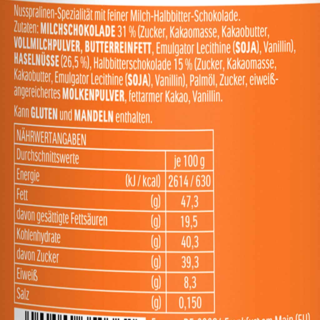 Zutaten: MILCHSCHOKOLADE 31 % (Zucker, Kakaomasse, Kakaobutter, VOLLMILCHPULVER, BUTTERREINFETT, Emulgator Lecithine (SOJA), Vanillin), HASELNÜSSE (26,5 %), Halbbitterschokolade 15 % (Zucker, Kakaomasse, Kakaobutter, Emulgator Lecithine (SOJA), Vanillin), Palmöl, Zucker, eiweißangereichertes MOLKENPULVER, fettarmer Kakao, Vanillin.