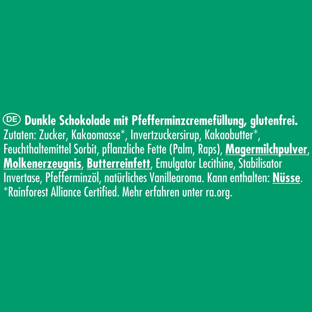Zutaten: Zucker, Kakaomasse*, Invertzuckersirup, Kakaobutter*, Feuchthaltemittel Sorbit, pflanzliche Fette (Palm, Raps), MAGERMILCHPULVER, MOLKENERZEUGNIS, BUTTERREINFETT, Emulgator Lecithine, Stabilisator Invertase, Pfefferminzöl, natürliches Vanillearoma. *Rainforest Alliance Certified.