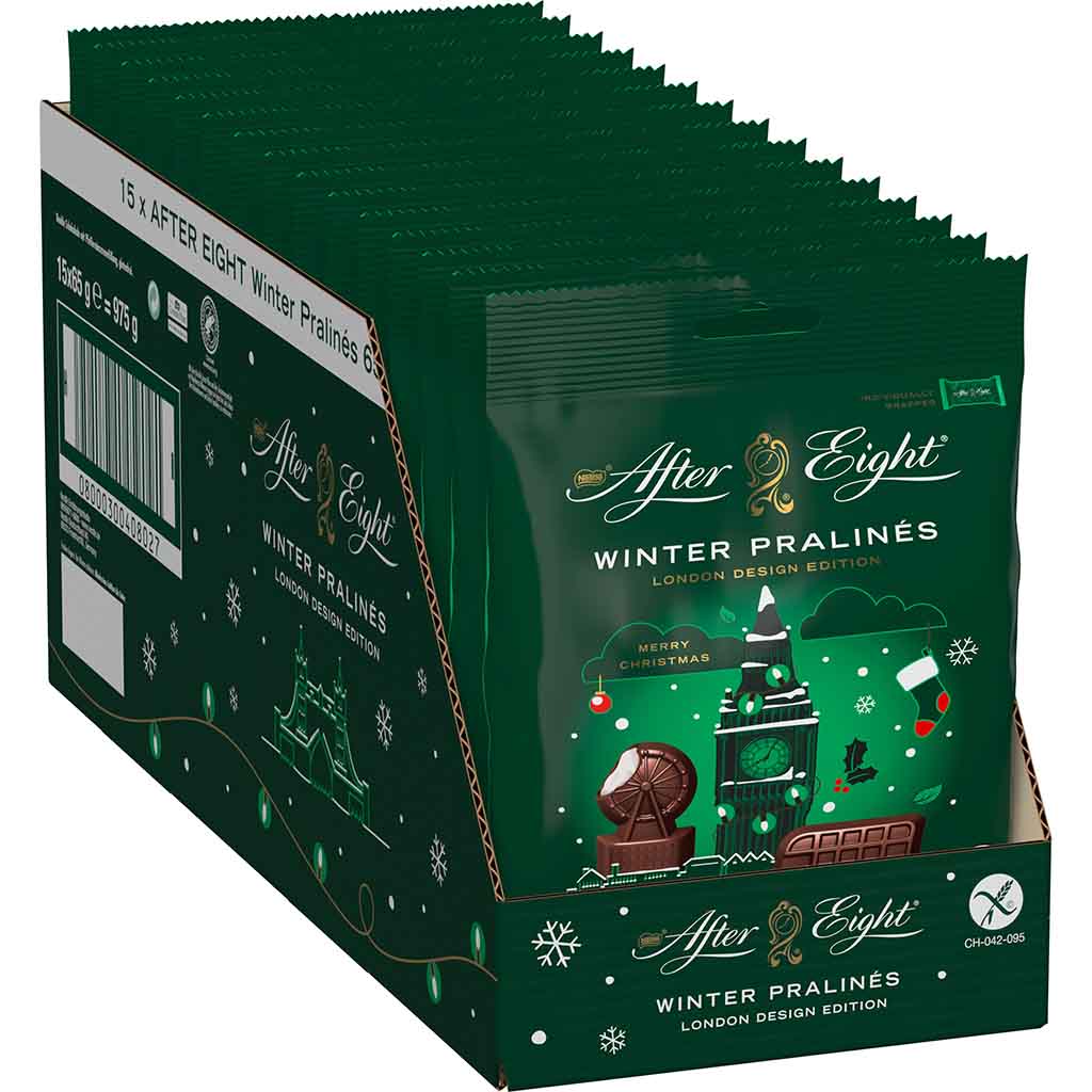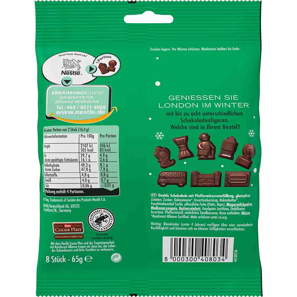 Pralinen aus Zartbitterschokolade mit cremiger Minzfüllung. Die feinen Pralinen bestehen aus Zartbitterschokolade und wurden in liebevollen Motiven gestaltet. Typische London-Symbole und weihnachtliche Figuren verschönern den Genussmoment.