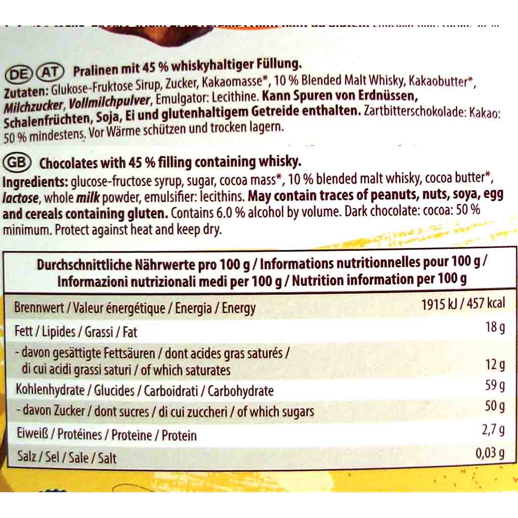 Zutaten: Glukose-Fruktose Sirup Zucker Kakaomasse 10 % Blended Malt Whisky Kakaobutter MILCHZUCKER VOLLMILCHPULVER Emulgator: Lecithine.