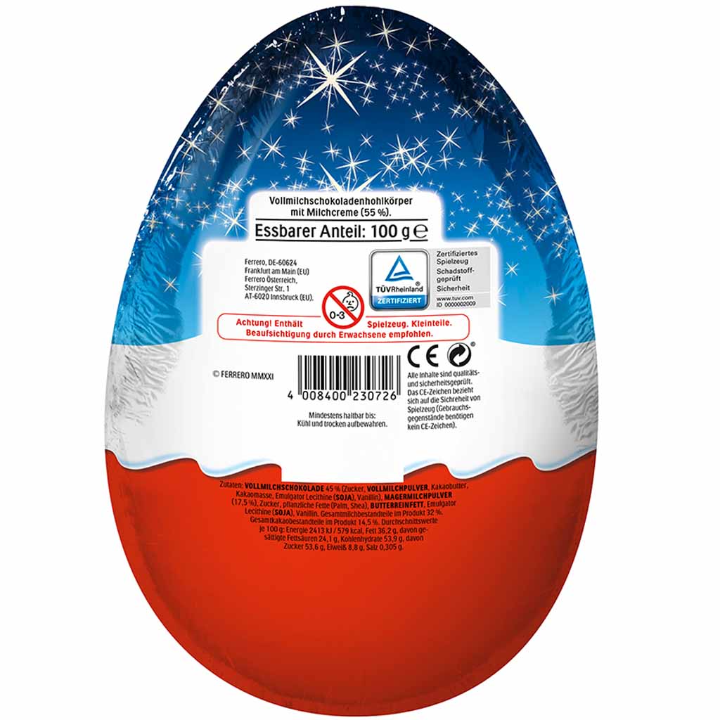 Überraschungsei aus Weißer- und Vollmilchschokolade mit Spielzeug und Sammelfigur " Frostige Fuchsfreunde ". Alle Ü-Eier mit weihnachtlichen Motiven.