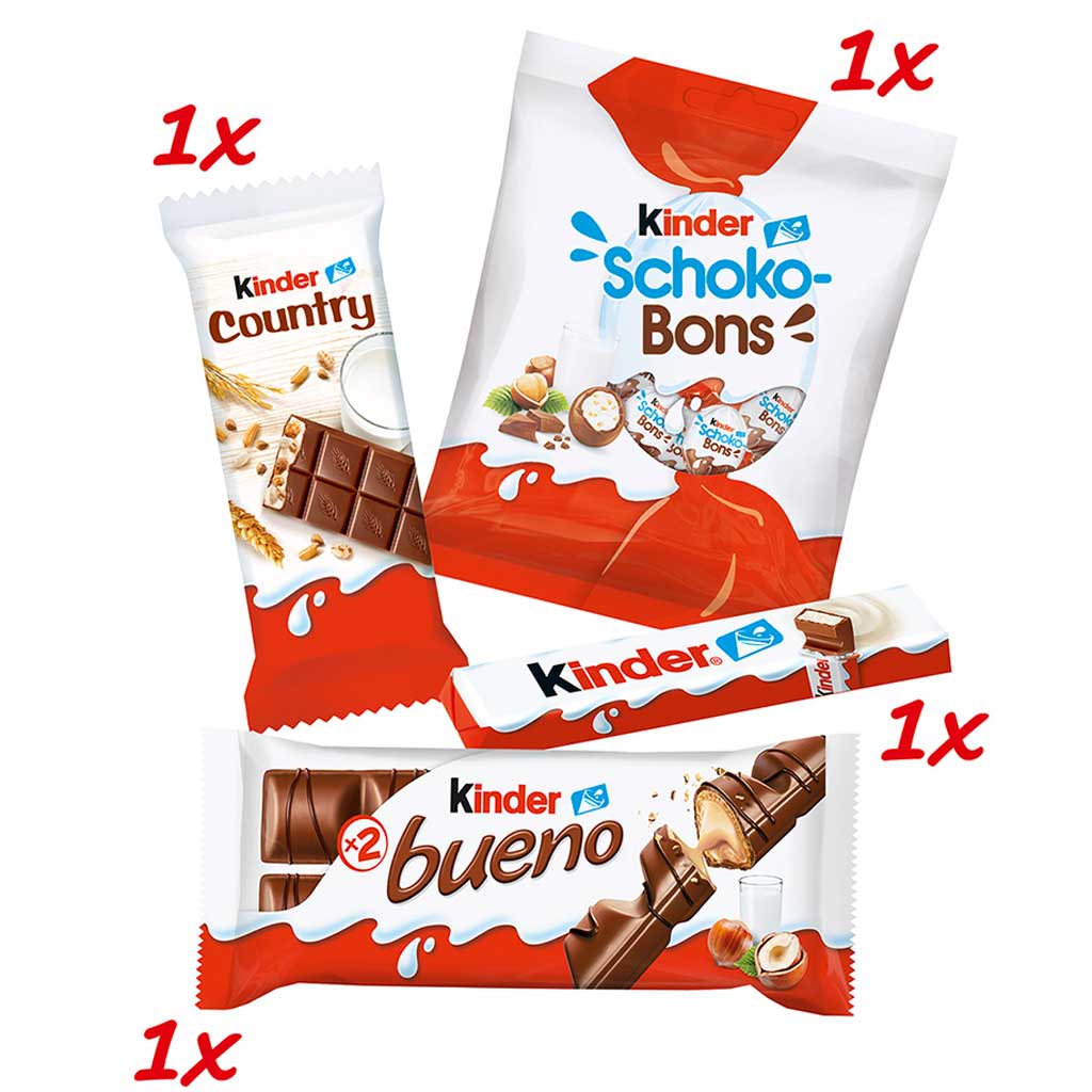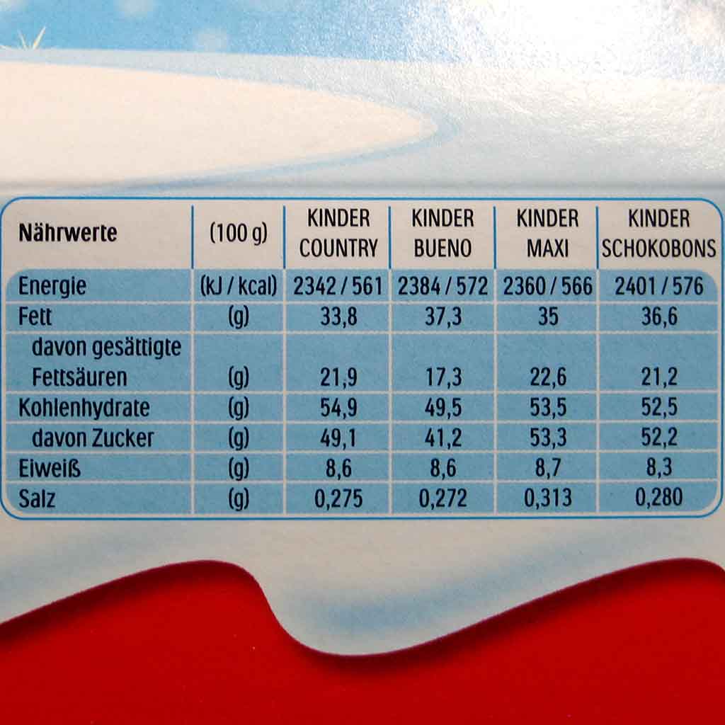 KINDER COUNTRY: VOLLMILCHSCHOKOLADE 33,5 % (Zucker, Kakaobutter, VOLLMILCHPULVER, Kakaomasse, Emulgator Lecithine (SOJA), Vanillin), Zucker, MAGERMILCHPULVER (17,5 %), Palmöl, gepufftes Getreide 7,5 % (GERSTE, Reis, WEIZEN, WEIZEN (Dinkel), Buchweizen), BUTTERREINFETT, Emulgator Lecithine (SOJA), Vanillin. Gesamtmilchbestandteile im Produkt 30,5 %.