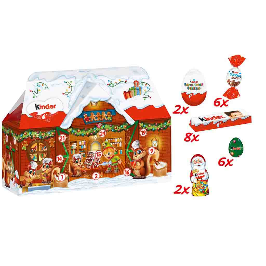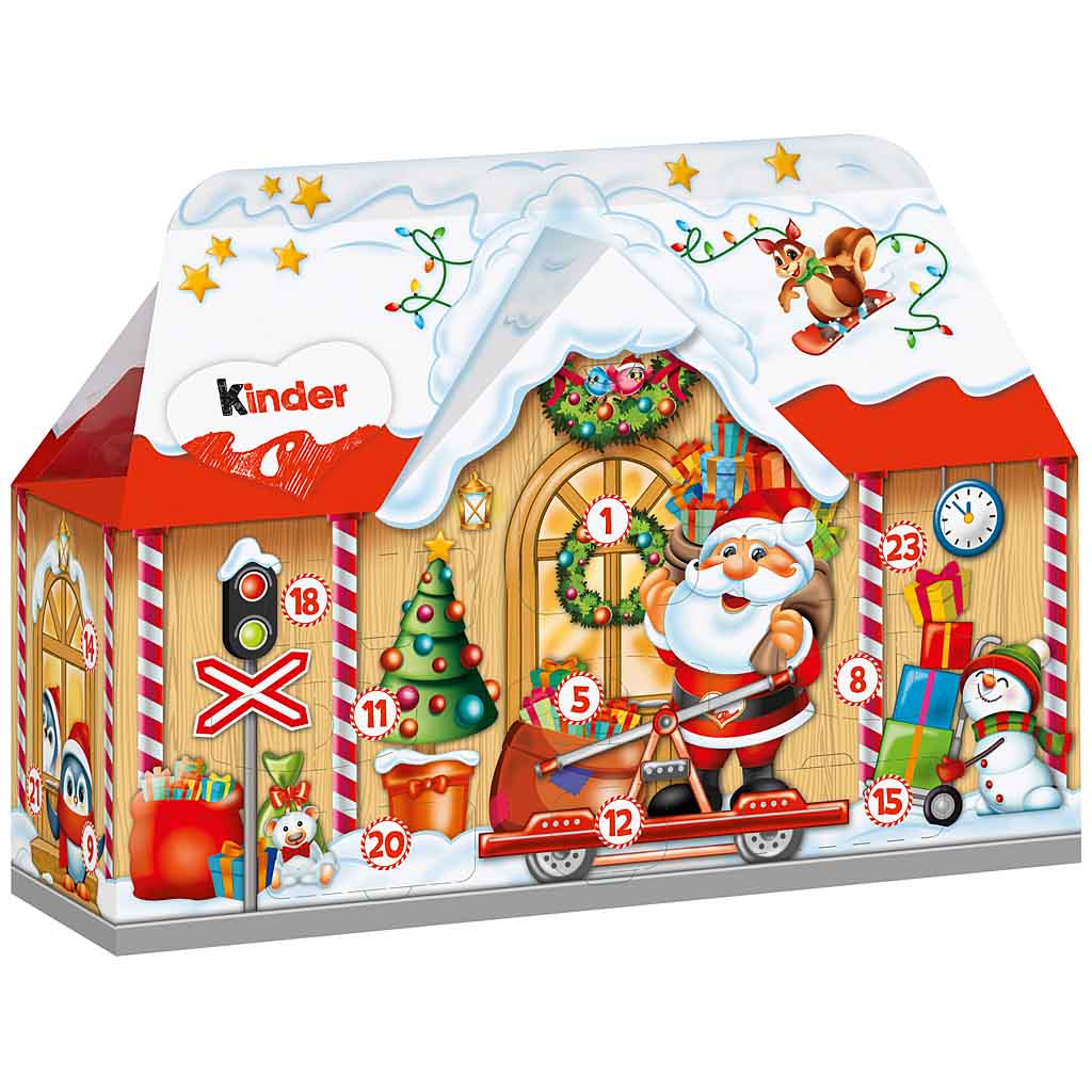 Ein Haus voller Spaß. Mit dem kinder Mix Adventskalender 3D-Haus wird die Weihnachtszeit zu einem süßen Vergnügen. Dieses aufwendig gestaltete Häuschen erscheint als Weihnachtsbahnhof oder als Weihnachtsbäckerei und bietet so einen liebevollen Einblick in den Arbeitsalltag des Weihnachtsmanns. Ein toller Kalender, der mit seinen Bildern Geschichten erzählt. Hinter den 24 Türchen, die das Häuschen rundherum zieren, verstecken sich leckere Überraschungen aus der beliebten kinder Schokolade. Verschiedene Motive, keine Auswahl möglich.