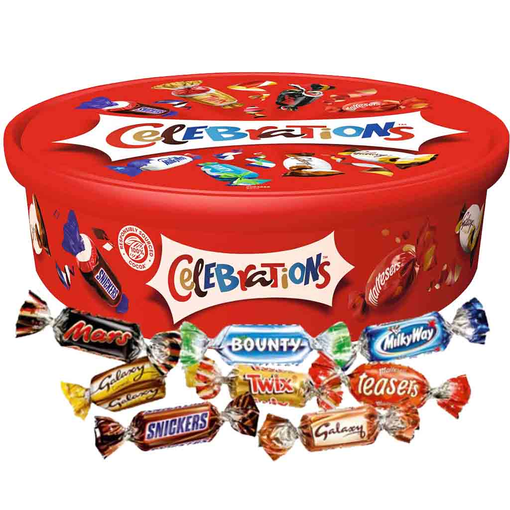Celebrations Snackbox mit Servierschale ist gefüllt mit Mini Schokoladen Riegeln - Snickers, Bounty, Twix, Galaxy, Galaxy Caramel, Mars, Milky Way und Maltesers.