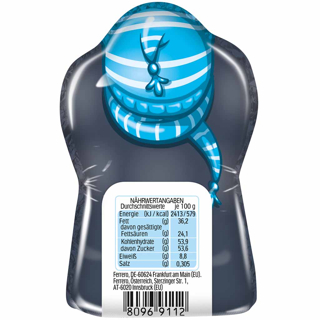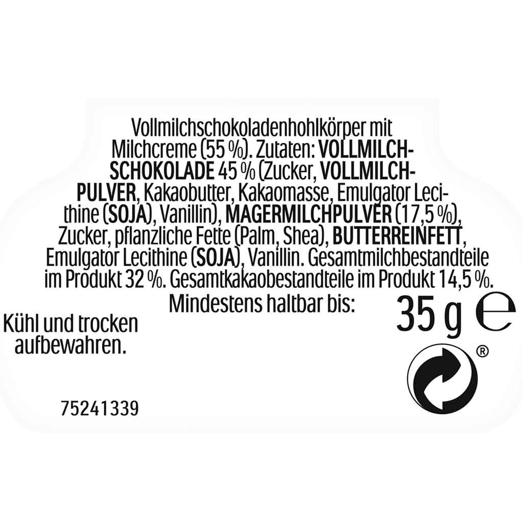 36 einzeln gewickelte Hohlfiguren aus Vollmilch-Schokoladen mit einer Schicht Milchcreme-Füllung.