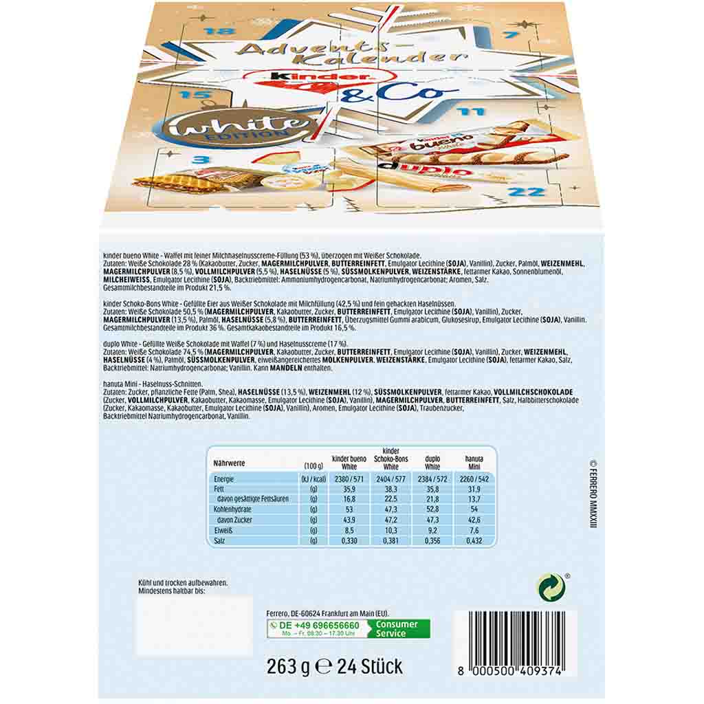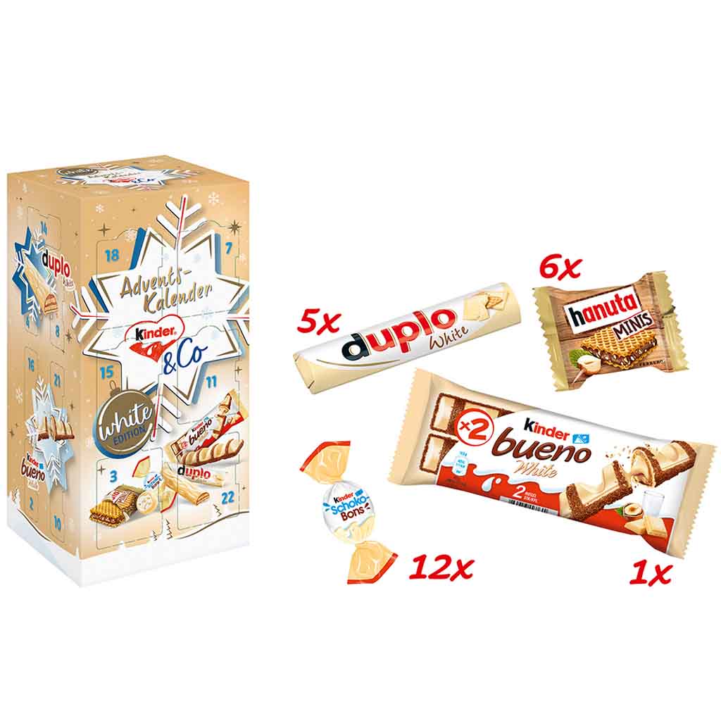 Adventskalender mit Kinder Produkte und weiter beliebte Produkte aus dem Ferrero-Sortiment. White Edition.
