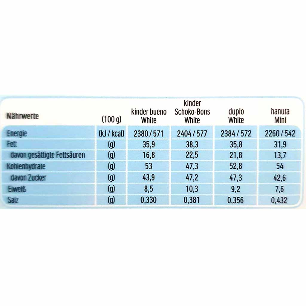 KINDER BUENO WHITE WHITE: Weiße Schokolade 28 % (Kakaobutter, Zucker, MAGERMILCHPULVER, BUTTERREINFETT, Emulgator Lecithine (SOJA), Vanillin), Zucker, Palmöl, WEIZENMEHL, MAGERMILCHPULVER (8,5 %), VOLLMILCHPULVER (5,5 %), HASELNÜSSE (5 %), SÜSSMOLKENPULVER, WEIZENSTÄRKE, fettarmer Kakao, Sonnenblumenöl, MILCHEIWEISS, Emulgator Lecithine (SOJA), Backtriebmittel: Ammoniumhydrogencarbonat, Natriumhydrogencarbonat; Aromen, Salz. Gesamtmilchbestandteile im Produkt 21,5 %.
