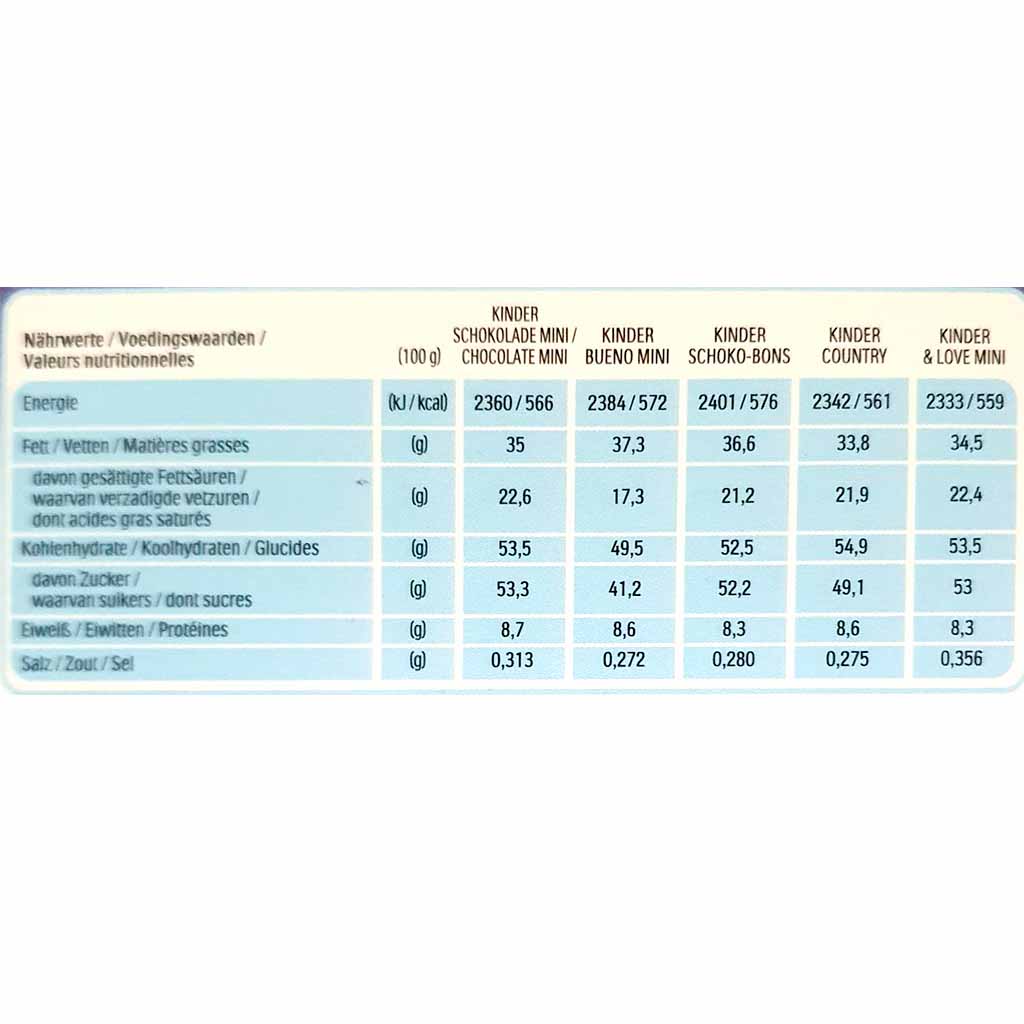 KINDER LOVE MINI: VOLLMILCHSCHOKLADE 45 % (Zucker, VOLLMILCHPULVER, Kakaobutter, Kakaomasse, Emulgator Lecithine (SOJA), Vanillin), Zucker, MAGERMILCHPULVER (16,5 %), Palmöl, BUTTERREINFETT, Emulgator Lecithine (SOJA), Vanillin. Gesamtmilchbestandteile im Produkt 32 %. Gesamtkakaobestandteile im Produkt 14,5 %.