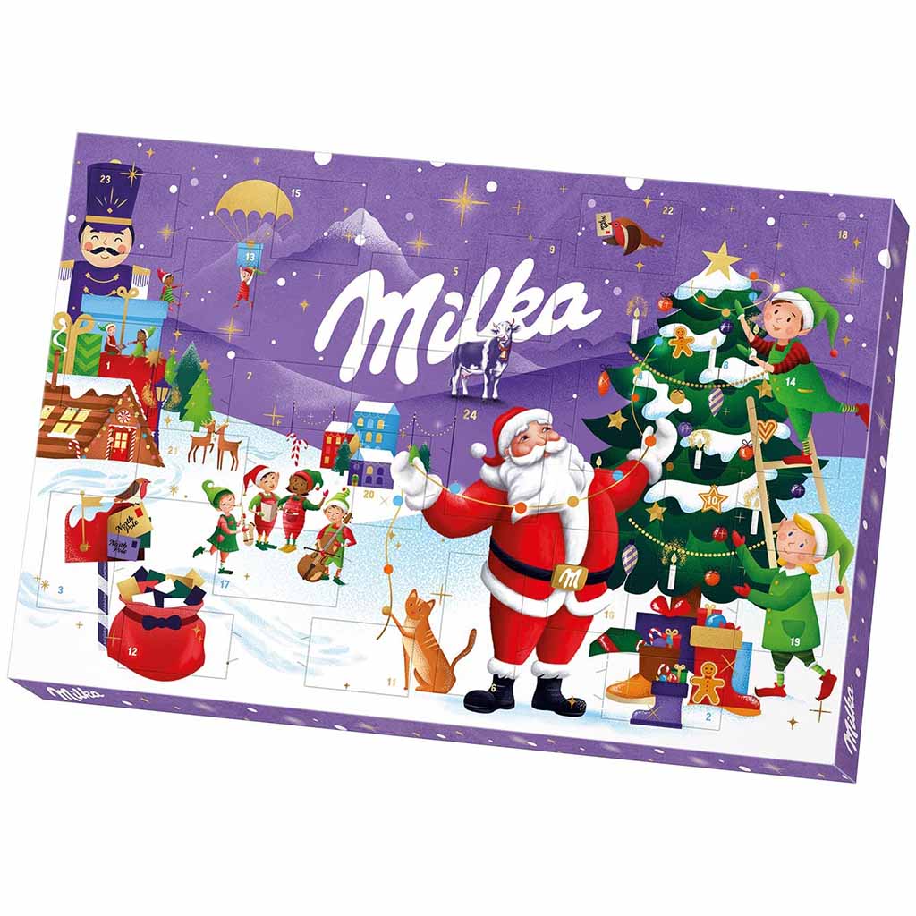 24 Alpenmilch Schokolade Figuren gefüllt mit Milchcreme. Adventskalender mit einer Mischung von Alpenmilch Schokolade gefüllt und ungefüllt. 2 verschiedene Motive, ohne Wahlmöglichkeit.